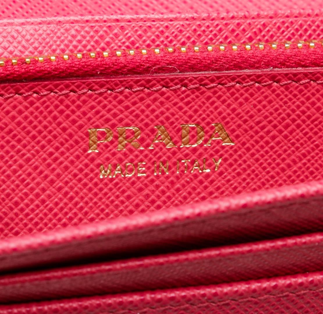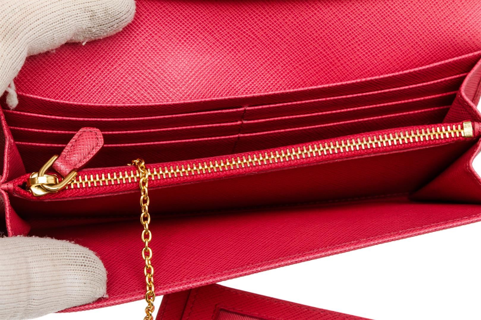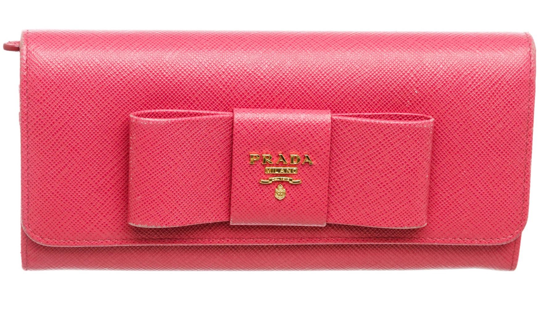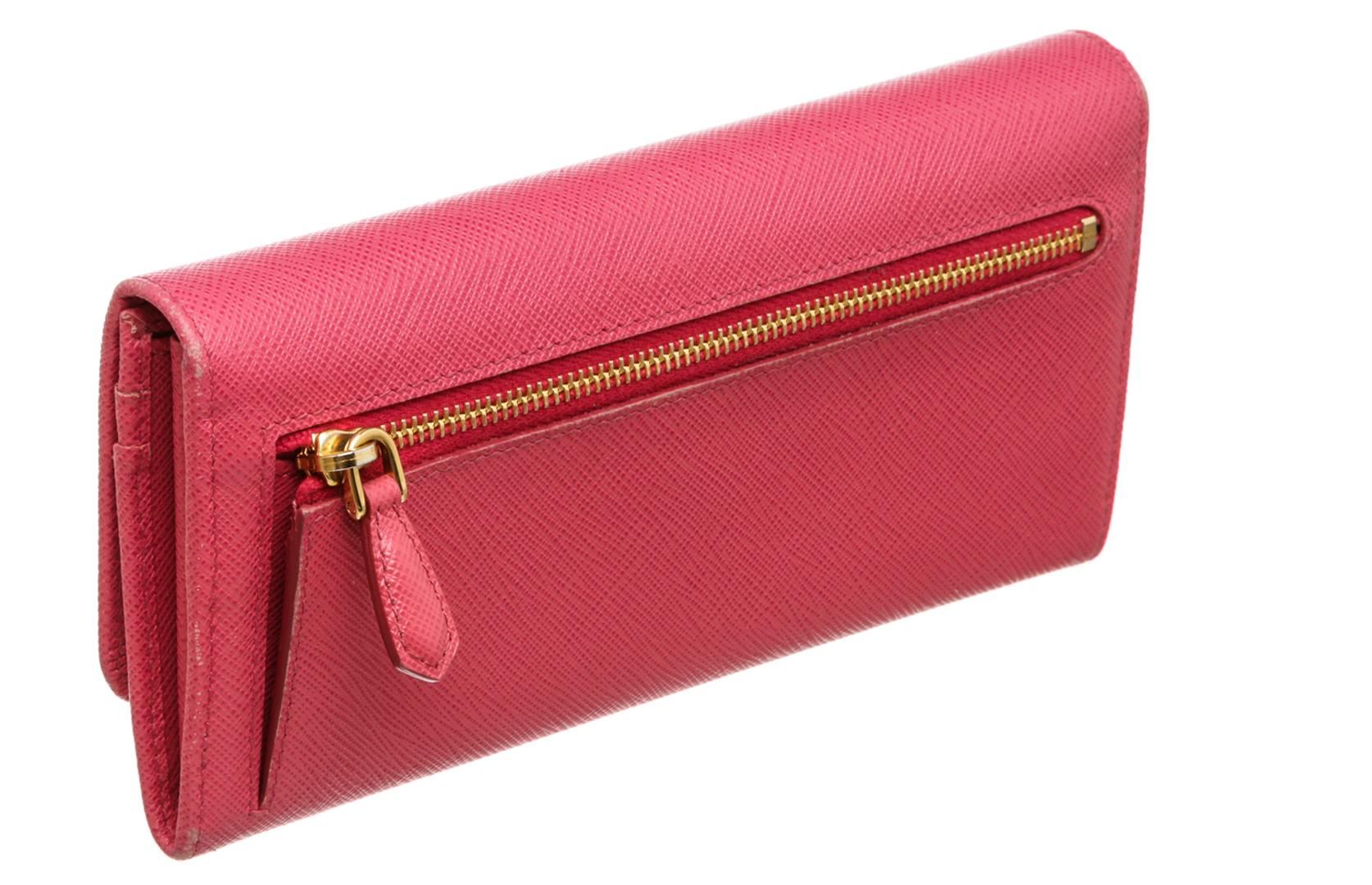 Pink Saffiano Lux leather Prada Fiocco wallet with gold-tone hardware, bow embellishment featuring logo adornment at front, exterior zip pocket at back, three interior compartments; one with zip closure, tonal leather lining, four bill compartments, 10 card slots at interior wall and dual snap closures at front flap.
