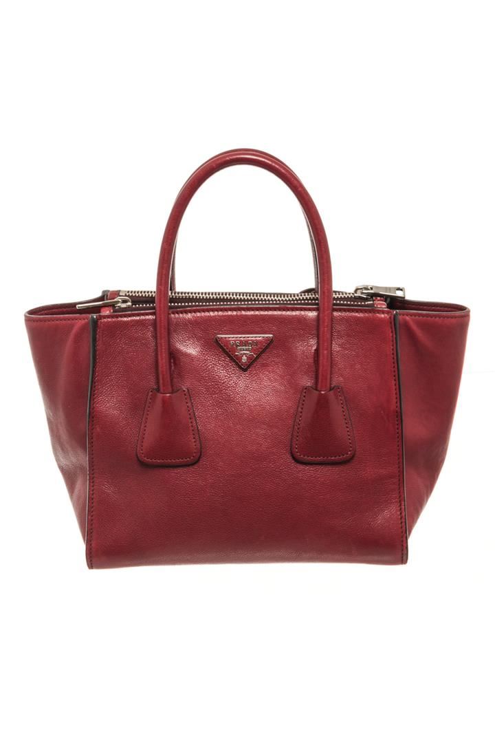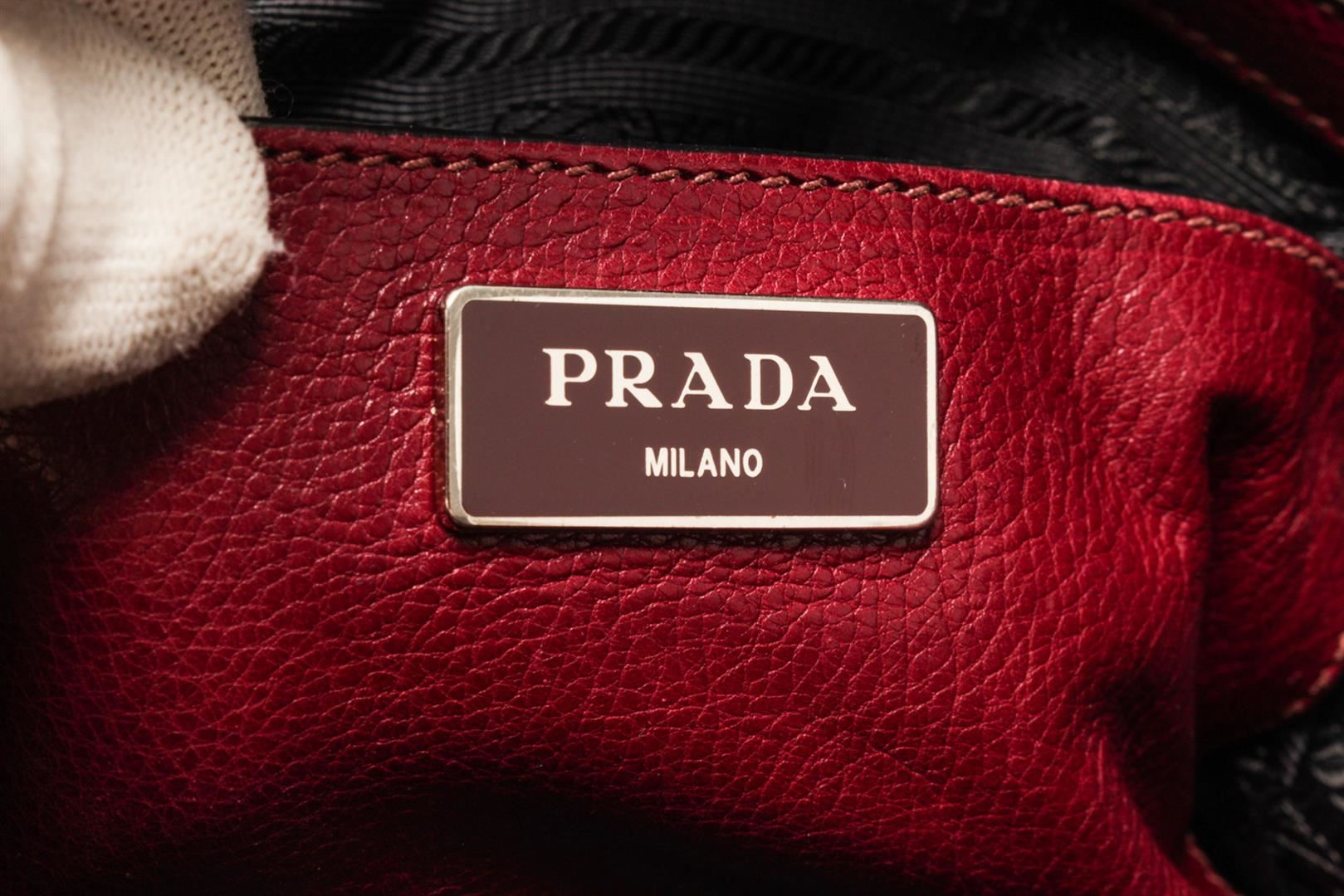 One Prada Red Calf Twin Pocket Tote Bag. Item is sold AS-IS. All available information is listed in the description and shown in the photo. Prada Red Calf Twin Pocket Tote Bag with top handle, detachable adjustable strap, Prada fabric lining, Prada pocket interior, silver tone hardware, zipper/snap closure. Height: 10.5" Width: 8" Depth: 11", Handle Drop: / 26.67 x 20.32 x 27.94 Cm