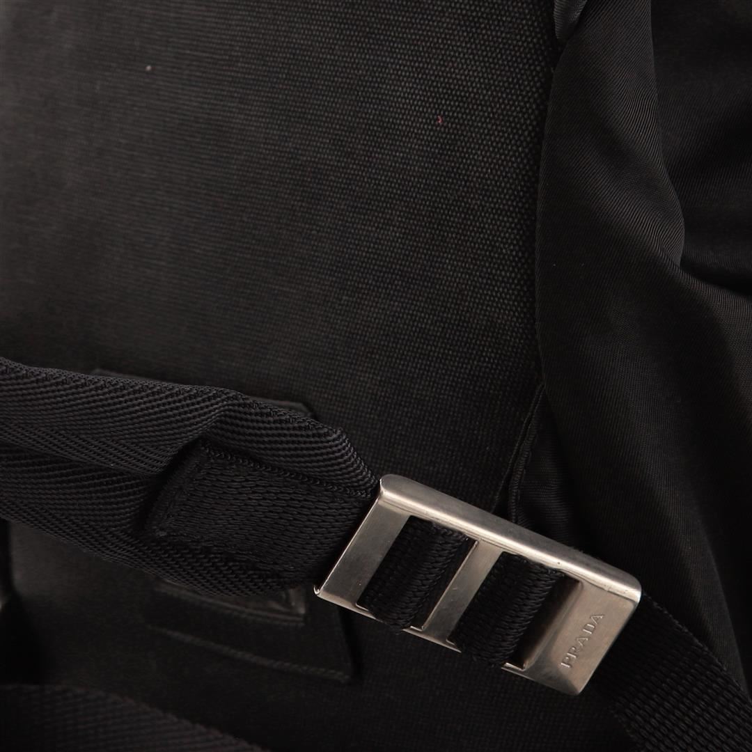 One Prada Single Buckle Pocket Backpack Tessuto Small. Item is sold AS-IS. All available information is listed in the description and shown in the photo. Prada Single Buckle Pocket Backpack Tessuto Small. Odor in interior. Wear on exterior and in interior, scuffs on rear, discoloration and wear in exterior pocket and in interior. Light glitter in interior, scratches and tarnish on hardware.