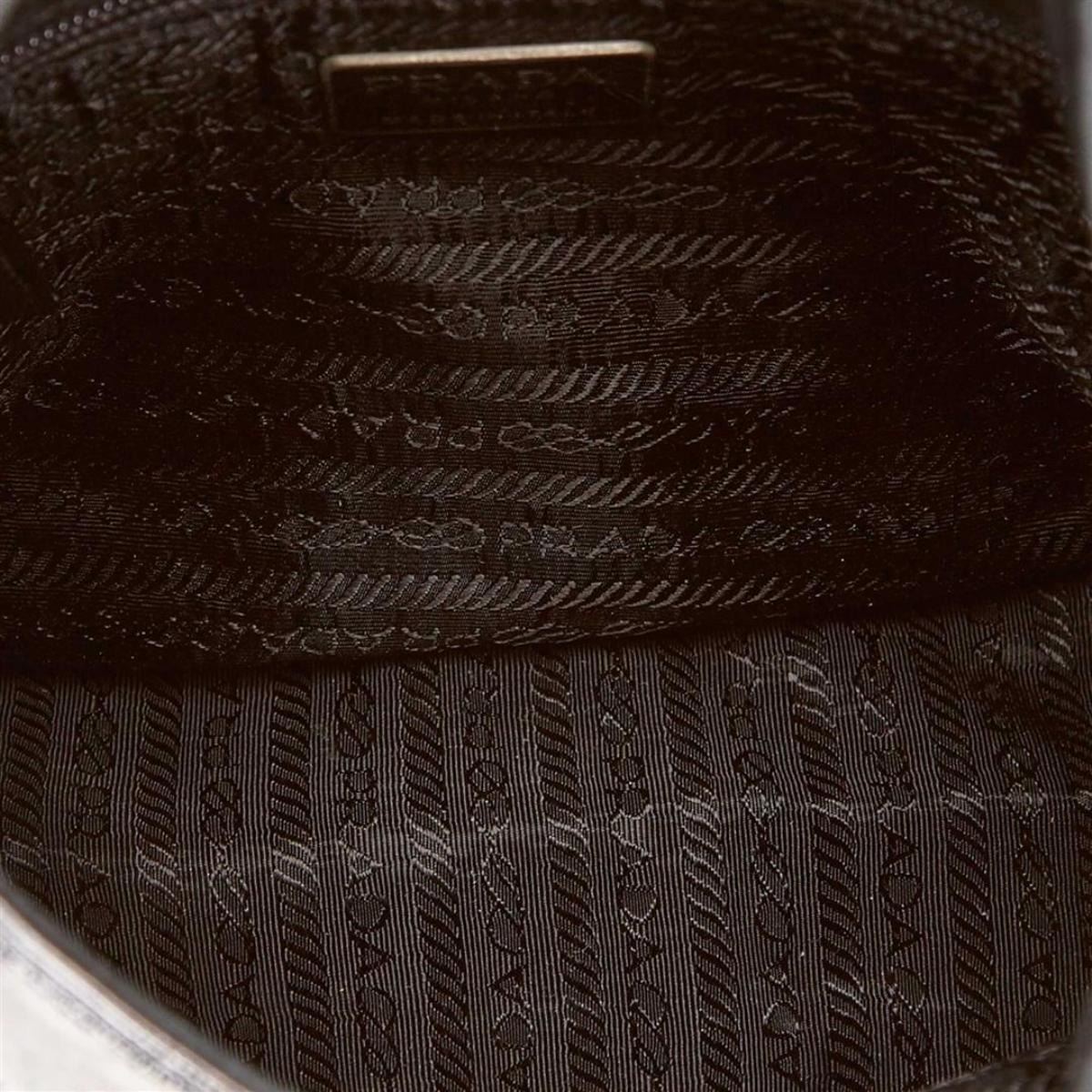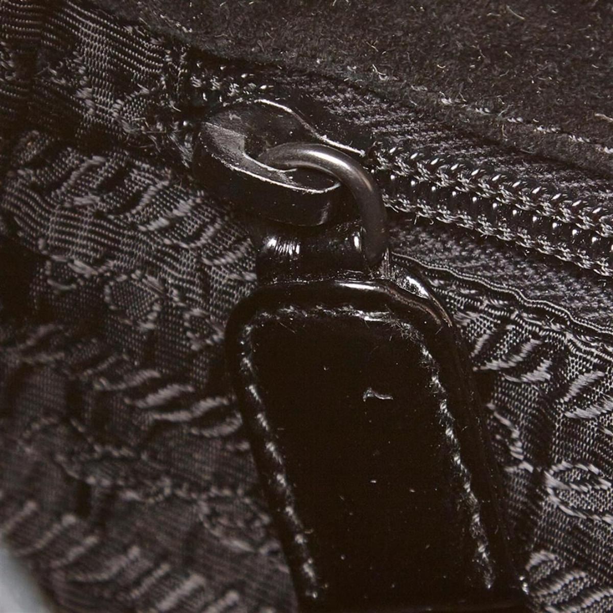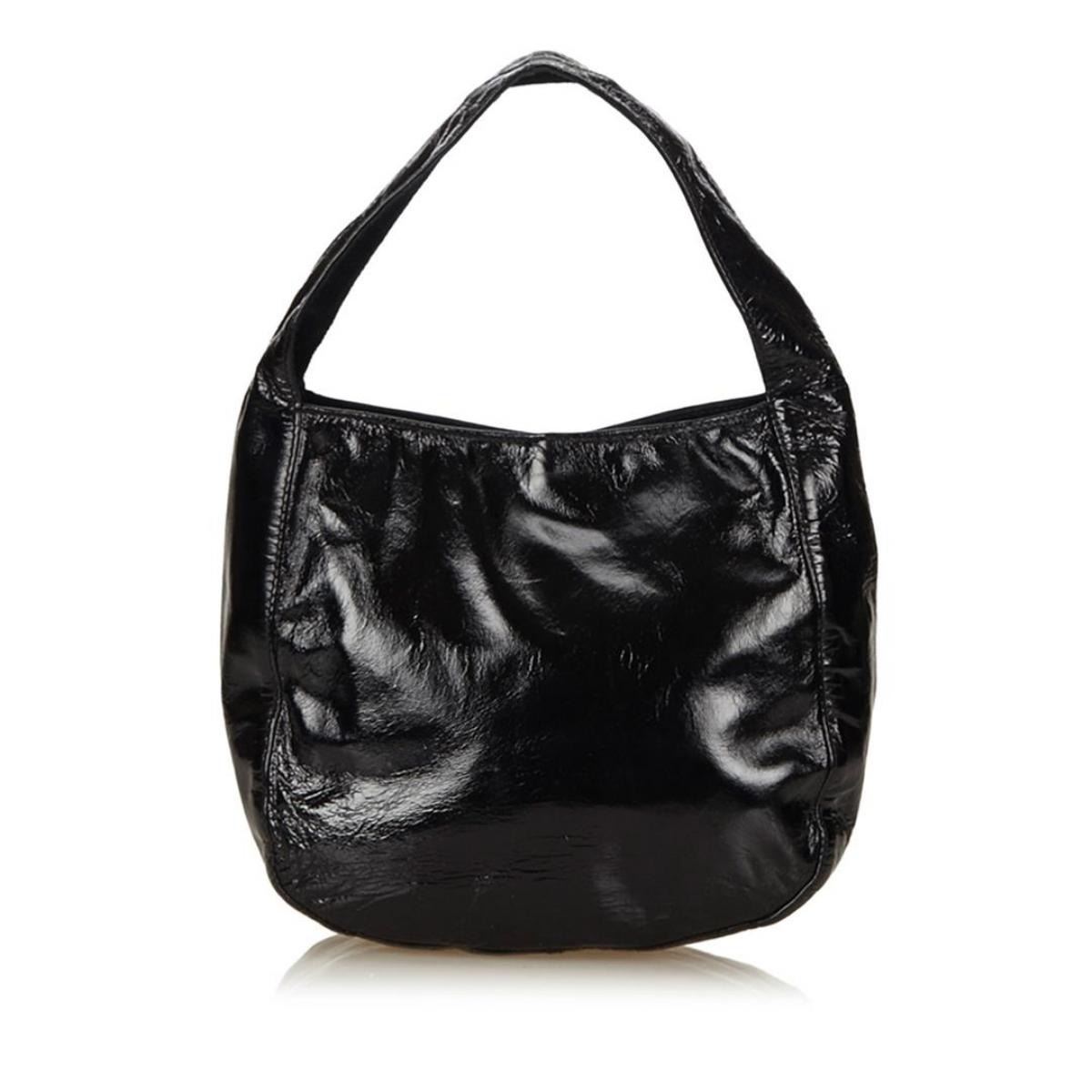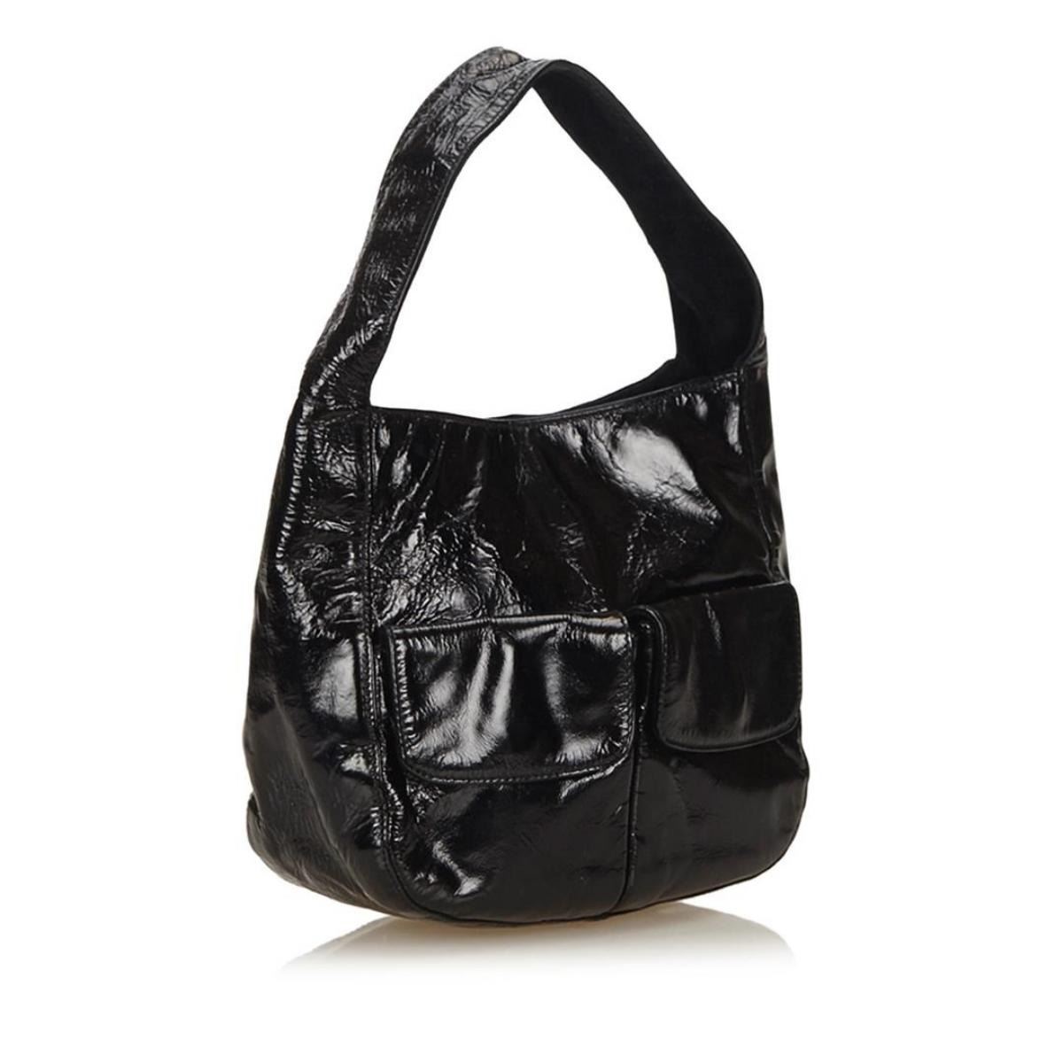 One Prada Small Patent Leather Handbag. This handbag features a patent leather body, exterior front flap pockets, flat leather handle, open top, and interior zip pocket.
