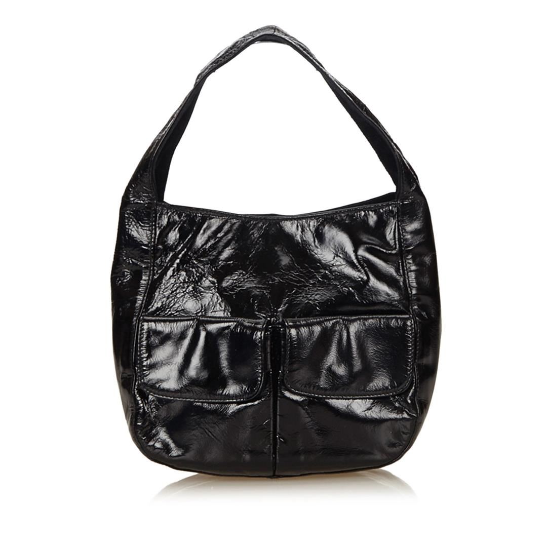 One Prada Small Patent Leather Handbag. This handbag features a patent leather body, exterior front flap pockets, flat leather handle, open top, and interior zip pocket.