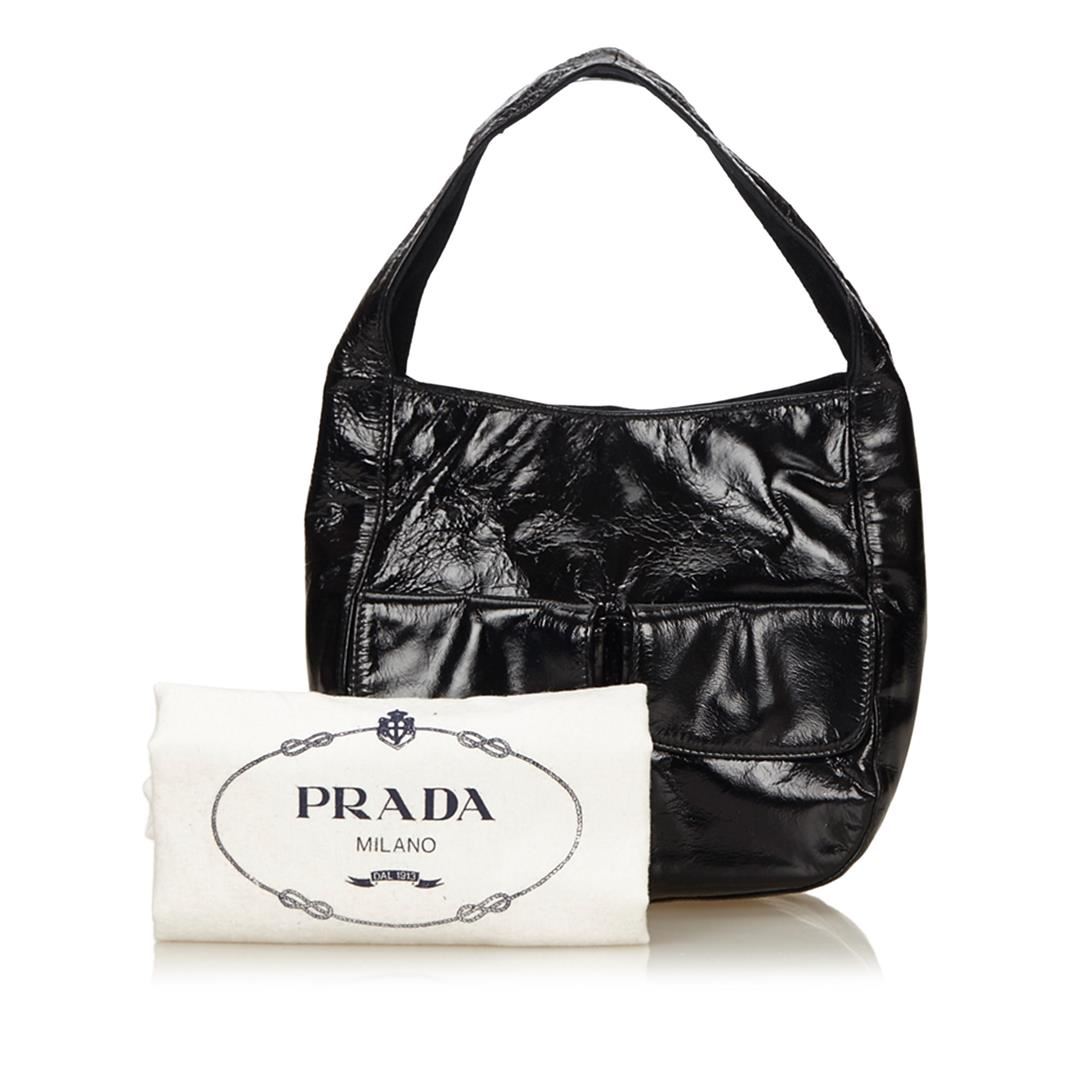 One Prada Small Patent Leather Handbag. This handbag features a patent leather body, exterior front flap pockets, flat leather handle, open top, and interior zip pocket.