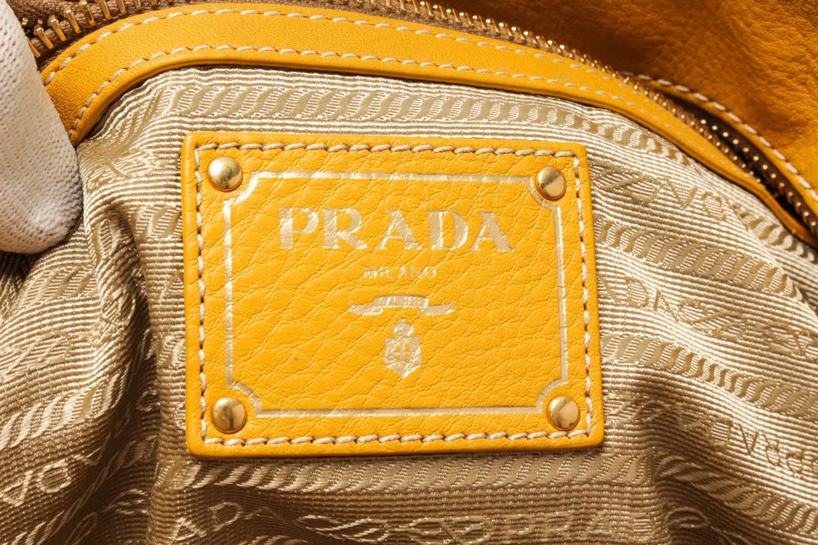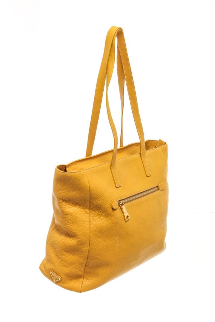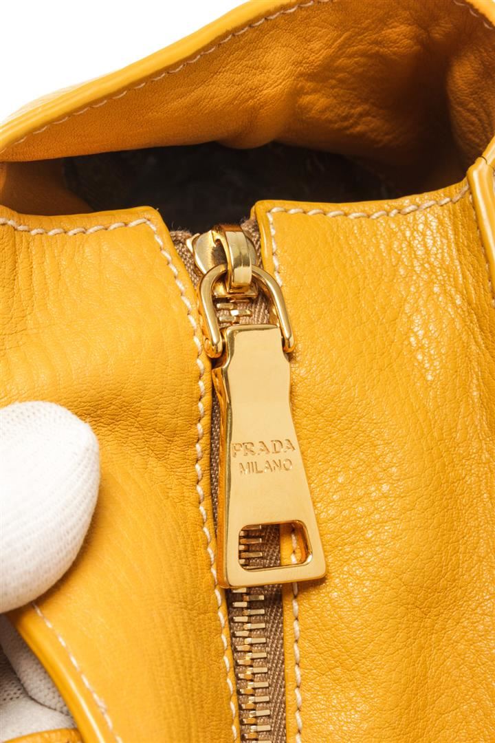 Prada Yellow Leather Front Pocket Tote Bag. All available information is listed in the description and shown in the photos. Prada Yellow Leather Front Pocket Tote Bag with shoulder strap, exterior zipper pocket, Prada fabric lining, interior slip pocket, gold tone hardware and zip closure.
