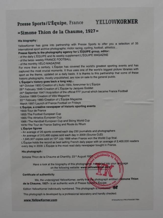 Simone Thion de la Chaume, 1927 Certified Photograph, Presse Sports/L'Equipe YellowKorner Certified Photograph. Certificate of Authenticity from YellowKorner affixed to the back. Matted Dimensions 16"x20". Protected with Clear Mylar Sleeve.
