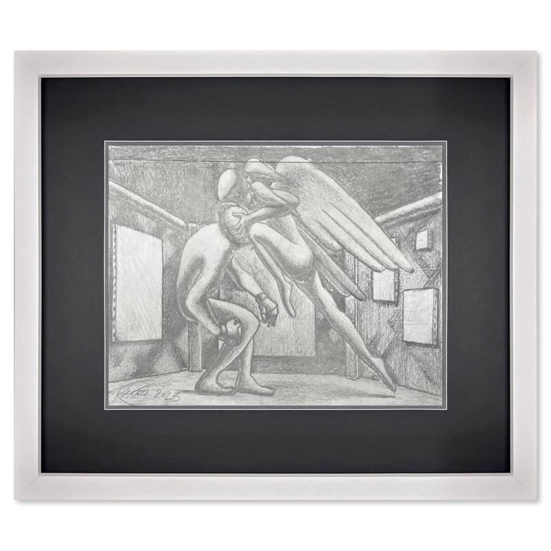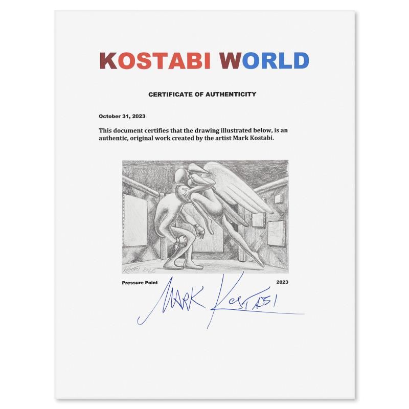 "Pressure Point" is an original drawing on paper by Mark Kostabi, hand signed by the artist. This piece comes custom framed and includes a certificate of authenticity. Measures approximately 14" x 17.5" (frame), 8" x 11.5" (image). This item requires special handling and may have a longer than usual turnaround.