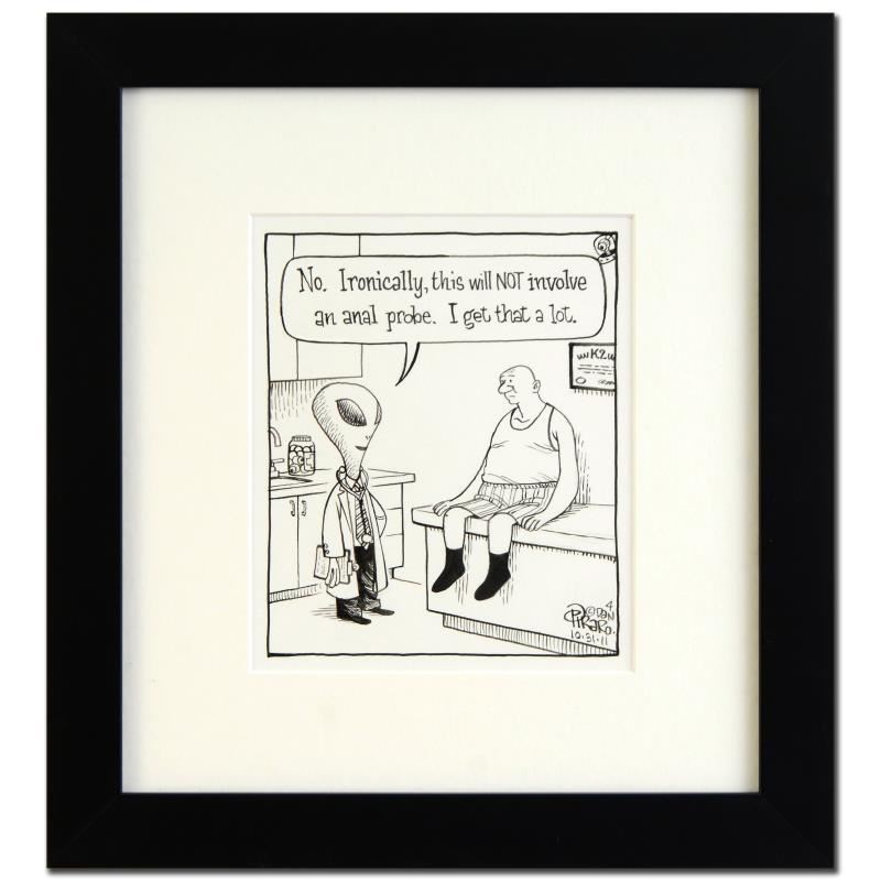 Enter a surreal and satirical world of twisted imagination and award winning creativity. "Probe" is an original pen & ink drawing on paper by Dan Piraro, creator of the critically acclaimed and award winning comic strip, Bizarro! This piece is hand signed and comes framed. Includes Certificate of Authenticity! Measures approx. 13" x 14" (frame), 6" x 7" (image).