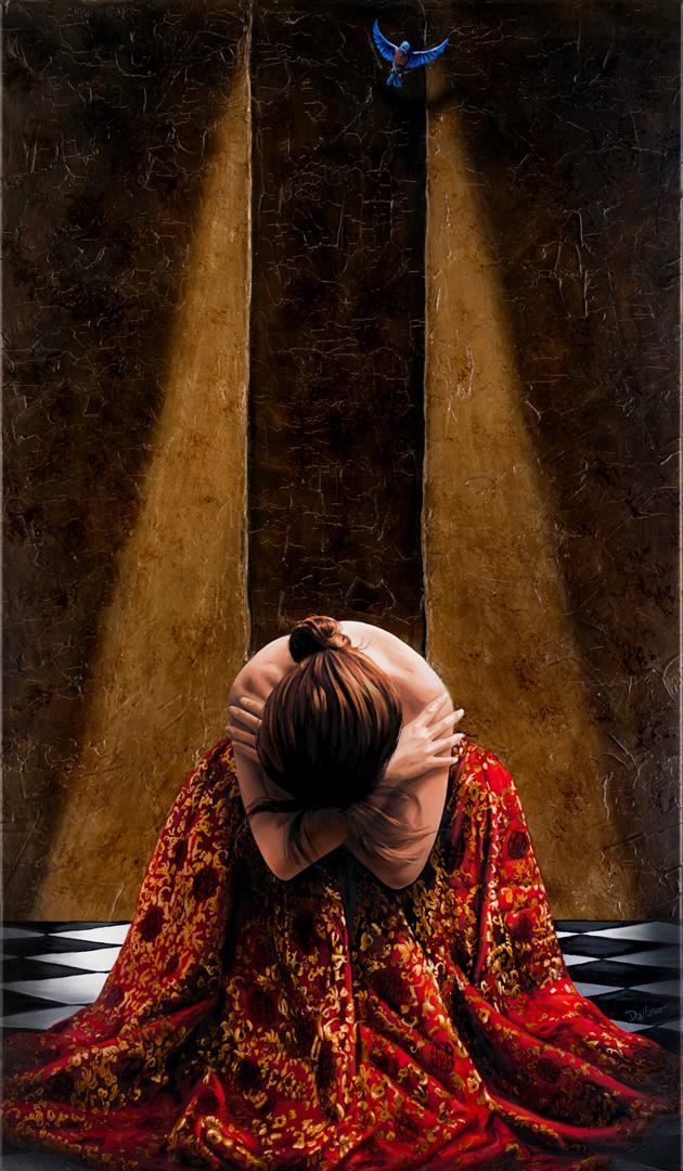 Protection by Dellorco. 48"x28" The vulnerability and fragility of a beautiful woman needs "Protection" at all times . The bluebird keeps watch . A Ltd.Edition giclee on canvas. S/n by the artist. Edition 195.
