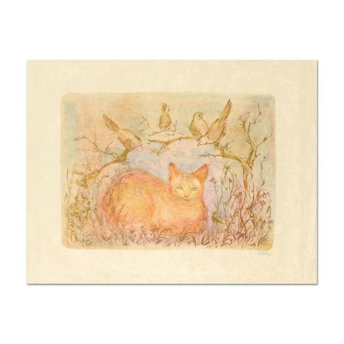 "Pumbit the Cat" is a lithograph on rice paper by Edna Hibel (1917-2014), hand signed by the artist. Includes Certificate of Authenticity. Measures approx. 26.5" x 20" (border), 19" x 14" (image). ** Please note: There is creasing in the border area that may be concealed when framed. Also, this piece is not numbered. **