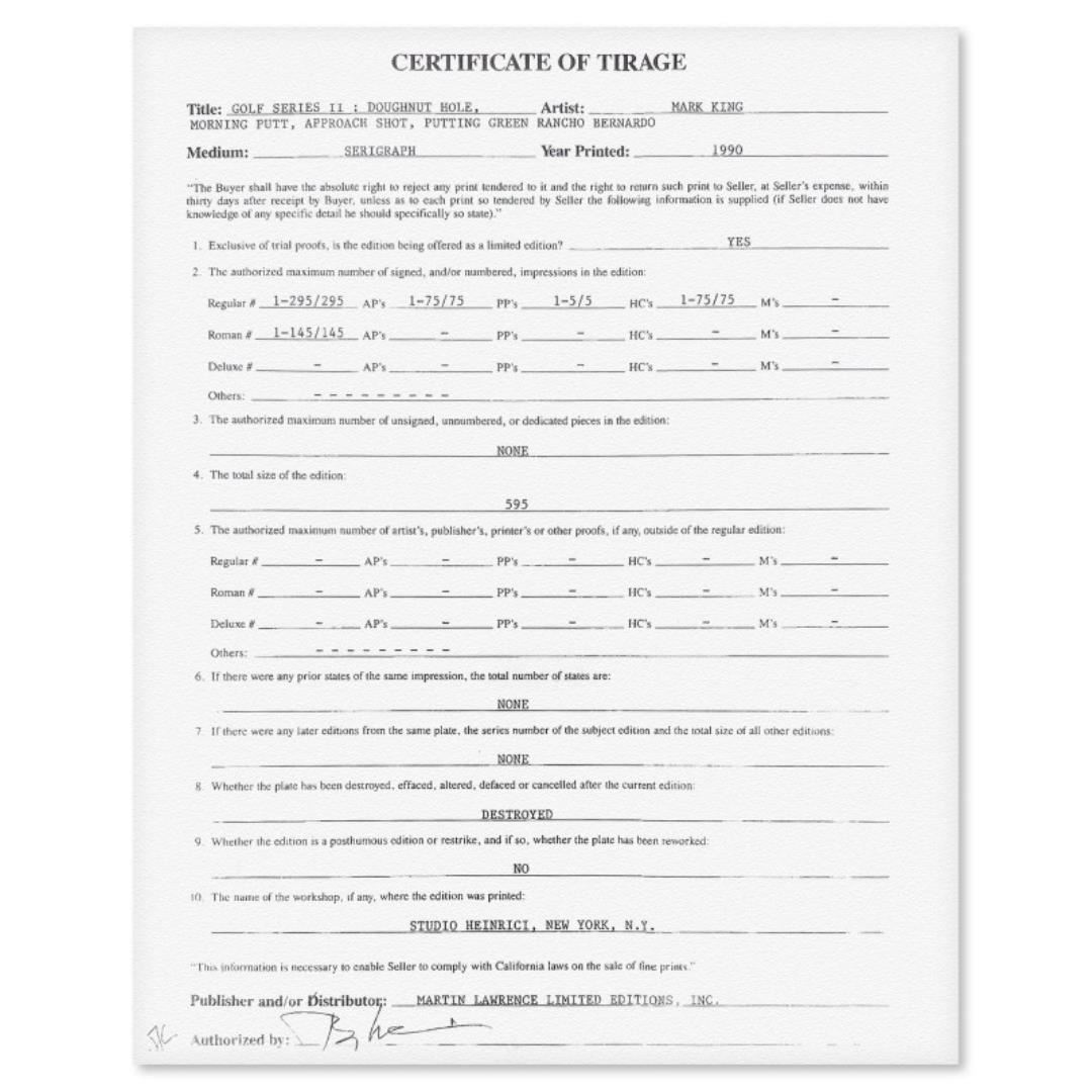 "Putting Green Rancho Bernardo" is a limited edition serigraph on paper by Mark King (1931-2014). Hand signed and numbered, this piece comes with a letter of authenticity and measures approximately 15" x 20" (image).