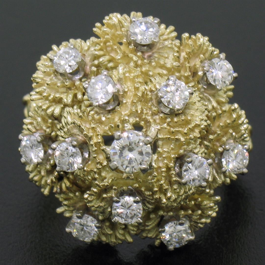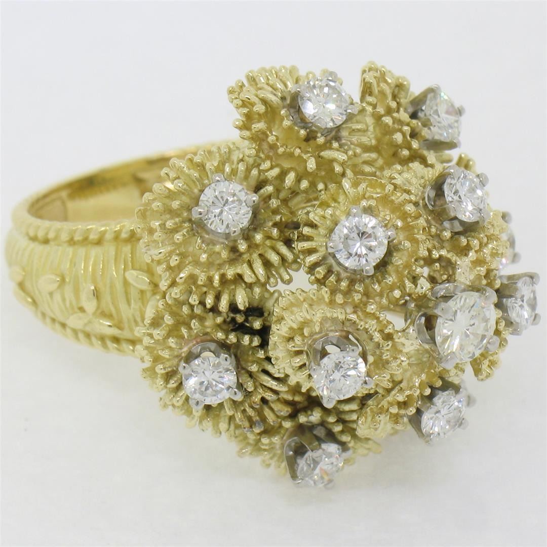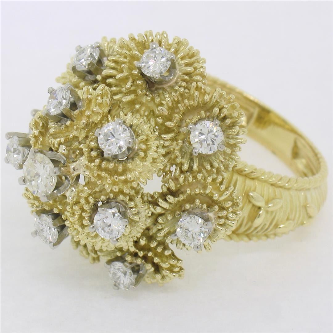 A vintage solid 18k yellow gold cluster cocktail ring, featuring 1 round brilliant cut natural diamond (F- VS1; 0.22ct ), surrounded with 12 round brilliant cut natural diamonds (E/F- VS1/VS2; 1.08ctw). The ring is size 8.0, weighs a total of 15.35 grams, and measures 22.50mm wide.