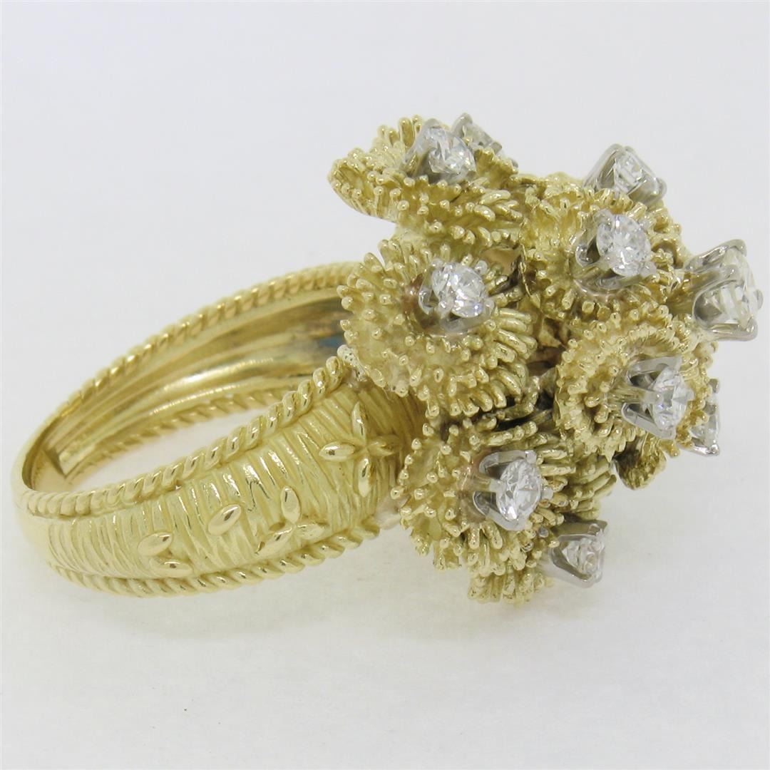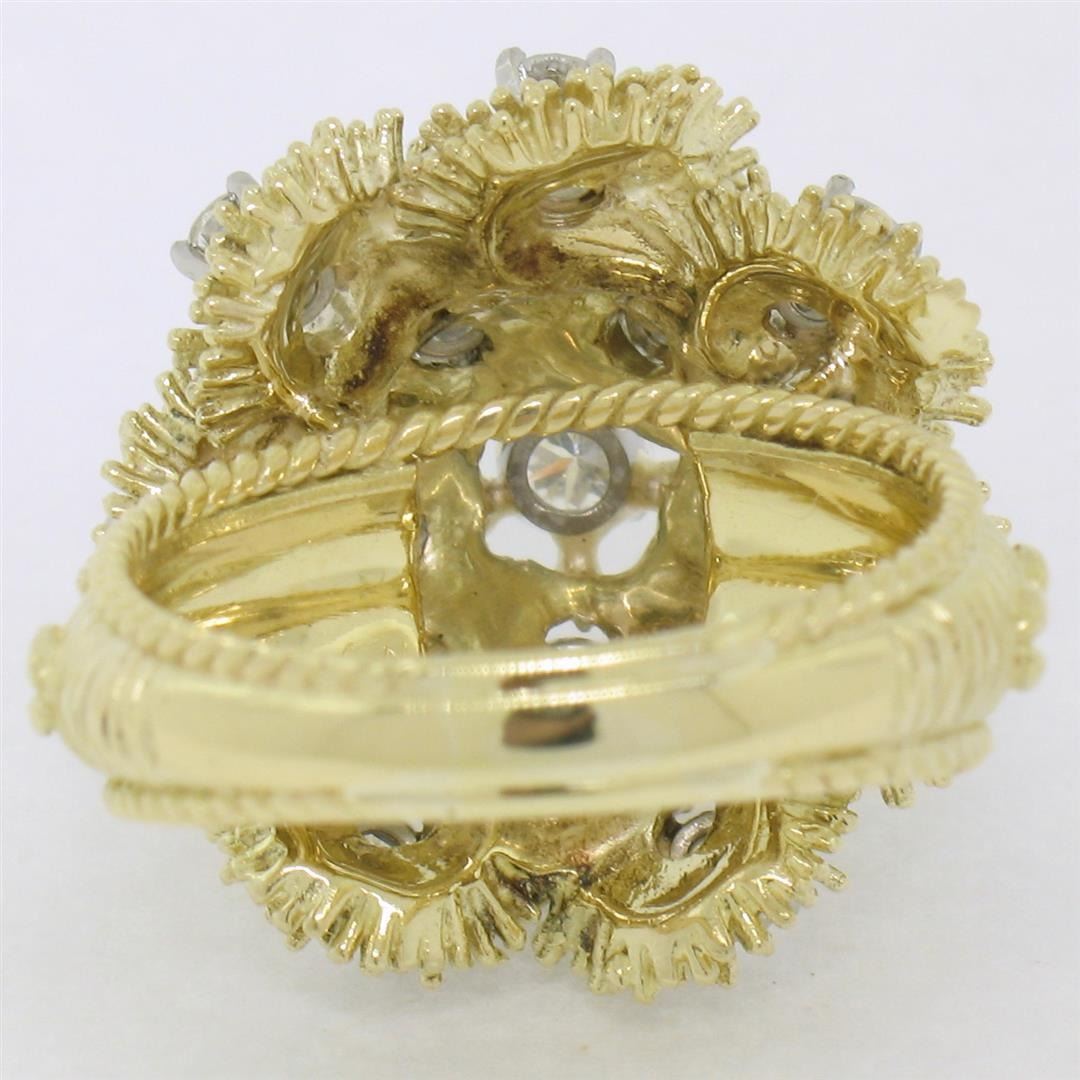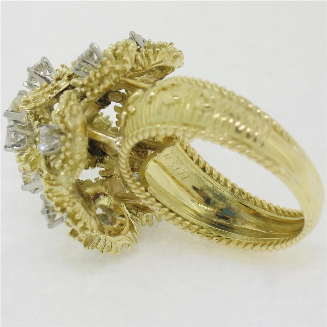 A vintage solid 18k yellow gold cluster cocktail ring, featuring 1 round brilliant cut natural diamond (F- VS1; 0.22ct ), surrounded with 12 round brilliant cut natural diamonds (E/F- VS1/VS2; 1.08ctw). The ring is size 8.0, weighs a total of 15.35 grams, and measures 22.50mm wide.