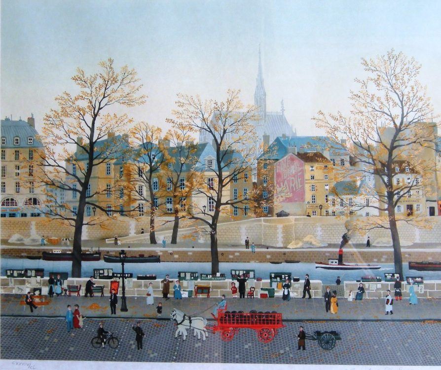 Quai des Orfevres by Michel Delacroix exhibits the town during autum with beautiful coloring. This is a framed limited edition with the size of 28" x 31 1/2".