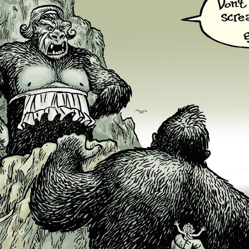 "Queen Kong" is a limited edition giclee on paper by Dan Piraro, creator of the critically acclaimed and award winning comic strip, Bizarro! This piece is numbered and hand signed by the artist and includes aletterof authenticity. Measures approximtely 8" x 15" (image).