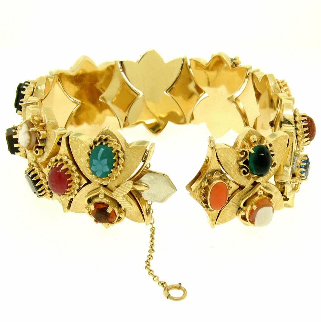 A wide, antique, solid 14k yellow gold charm bracelet with 18 florentine finished slide charms which are set with 27 gemstones of various shapes and colors. It weighs a total of 100.0 grams, measures 27.50mm wide, and measures 7.5 inches in length.