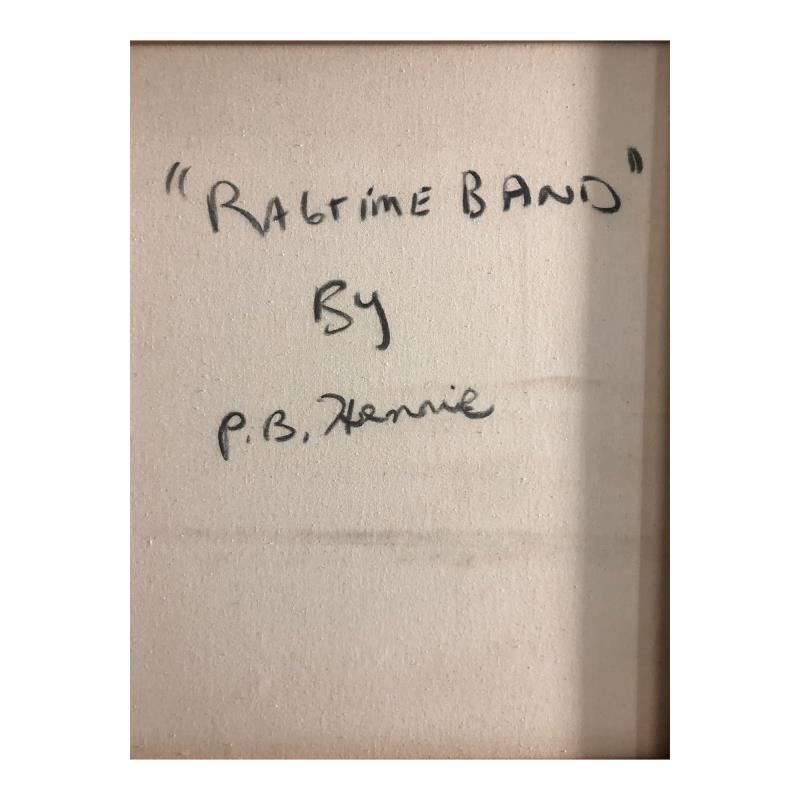 "Ragtime Band" is an original oil painting on stretched canvas by Paul Blaine Henrie (1932-1999). The piece is hand signed by the artist and comes with a letter of authenticity. Please note that due to the age of this piece and the way it was stored, there are minor sings of wear, particularly on the corners and edges. There is also some paint peeling in the top right. Measures approximately. 30" x 48" (image).
