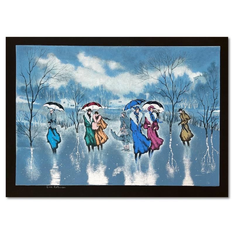"Rainy Day" is a limited edition serigraph on paper by Zina Roitman. The piece comes hand signed by the artist numbered and with a letter of authenticity. Measures approximately 18" x 27".