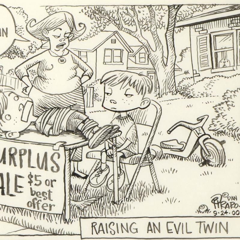 Enter a surreal and satirical world of twisted imagination and award winning creativity. "Raising an Evil Twin" is an original pen & ink drawing on paper by Dan Piraro, creator of the critically acclaimed and award winning comic strip, Bizarro. This piece
