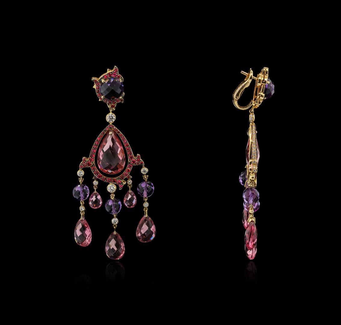 One pair electronically tested 18KT rose gold ladies cast & assembled multi gemstone & diamond dangle earrings with omega backs. Each earring features a floating pink tourmaline set within a red spinel frame supported by pink tourmaline, amethyst and diamond dangles, completed by an amethyst accented by red spinel. The earrings are from Ralph Lauren's New Romantic Collection. Stamped JACV00025. Bright and anodized finish. Trademark is Ralph Lauren. Identified with markings of "750". Condition is good. Containing: Two peg set briolette cut natural pink tourmalines, measuring 16.50 x 10.80 x 5.50mm, approximate total weight of 13.30 ct., clarity is eye clean, medium dark, moderately strong, pink color, (GIA Pk 6/4), cut is good. Transmitting light with no distortion, transparent. Color grade is an average for the pair. Graded in the setting. Six peg set briolette cut natural pink tourmalines, measuring 11.50 x 9.00 x 5.00mm, approximate total weight of 21.00 ct., clarity is eye clean, medium dark, moderately strong, pink color, (GIA Pk 6/4), cut is good. Transmitting light with no distortion, transparent. Color grade is an average for the group. Graded in the setting. Four peg set briolette cut natural pink tourmalines, measuring 6.00 x 5.00 x 3.50mm, approximate total weight of 3.00 ct., clarity is eye clean, medium dark, moderately strong, pink color, (GIA Pk 6/4), cut is good. Transmitting light with no distortion, transparent. Color grade is an average for the group. Graded in the setting. Six peg set briolette cut natural amethysts, measuring 6.50 x 6.45 x 6.50mm, approximate total weight of 9.60 ct., clarity is eye clean, type II, medium dark, moderately strong, purple color, (GIA P 6/4), cut is good. Transmitting light with no distortion, transparent. Color grade is an average for the group. Graded in the setting. Two prong set round cabochon cut natural amethysts, measuring 9.00 x 9.00 x 4.95mm, approximate total weight of 5.80 ct., clarity is eye clean, type II, medium dark, moderately strong, purple color, (GIA P 6/4), cut is good. Transmitting light with no distortion, transparent. Color grade is an average for the pair. Graded in the setting. One hundred twenty-six bead set round brilliant cut natural red spinels, measuring 1.70 - 1.20 x 0.94 mm, approximate total weight of 1.36ct., clarity is eye clean, medium dark, moderately strong, slightly purplish red color, (GIA slpR 6/4), cut is good. Transmitting light with no distortion, transparent. Color grade is an average for the group. Graded in the setting. Four bezel set round brilliant cut diamonds, measuring 3.30 - 3.20 x 1.95mm (depth est.) approximate total weight of 4 Stones = 0.50 ct. Graded in the setting. Clarity: VS-1 to VS-2. Color: G - H. Six bezel set round brilliant cut diamonds, measuring 2.30 - 2.30 x 1.38mm (depth est.) approximate total weight of 6 Stones = 0.30 ct. Graded in the setting. Clarity: VS-1 to VS-2. Color: G - H. Eight bezel set round brilliant cut diamonds, measuring 1.80 - 1.80 x 1.08mm (depth est.) approximate total weight of 8 Stones = 0.20 ct. Graded in the setting. Clarity: VS-1 to VS-2. Color: G - H. One Hundred Forty-Eight bead set round brilliant cut diamonds, measuring 1.20 - 0.90 x 0.63mm (depth est.) approximate total weight of 148 Stones = 0.75ct. Graded in the setting. Clarity: VVS-2 to VS-1. Color: G - H. Total Weight of Colored Stones: 54.06 ct. Total Weight of Diamonds: 1.75 ct. Total Weight of Earrings: 27.70 gm. AIG Appraised.