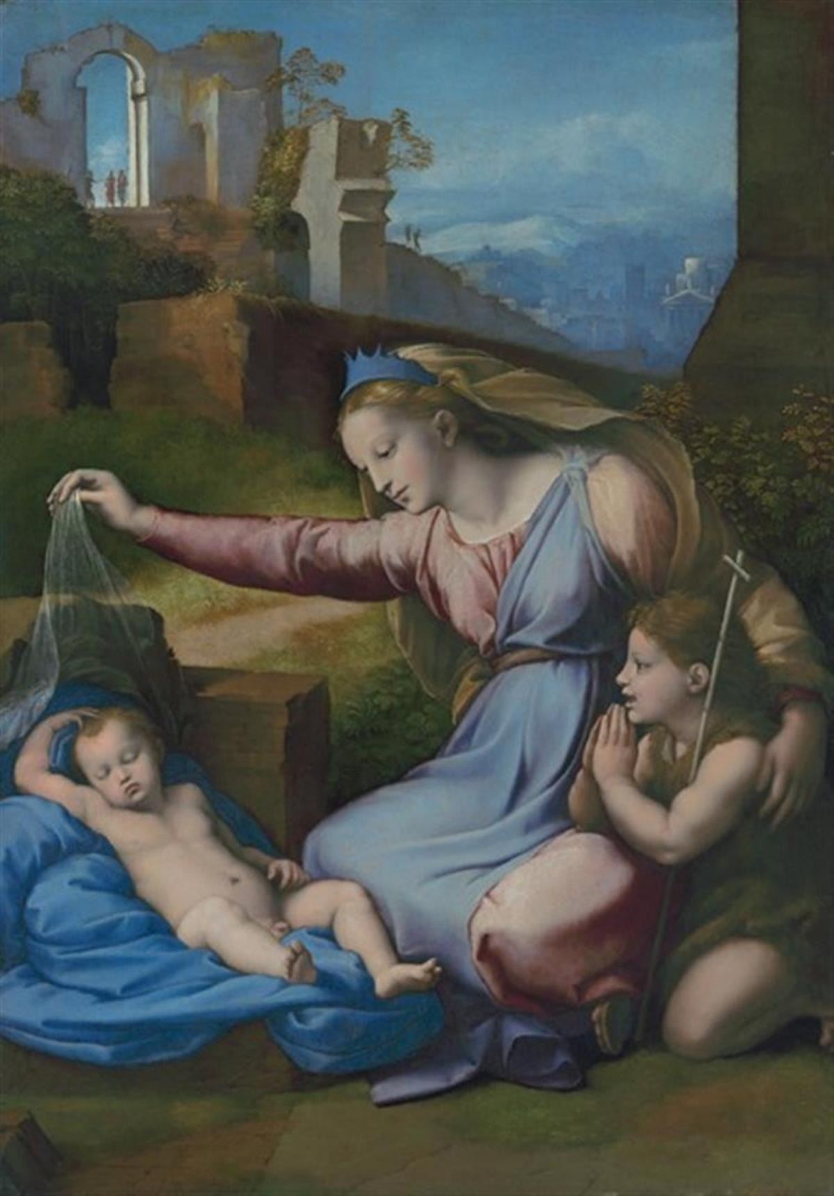 Artist: Raphael Gianfrancesco Penni - Title: Madonna with the Blue Diadem - Medium: Fine Art Reproduction Giclee on Canvas - Image Size: Approximately 32 inches x 22.5 inches - Unframed on Unstretched Canvas - Biography: Gianfrancesco Penni (1488/1496-1528), also known as Giovan Francesco, was an Italian painter. His brother Bartolommeo was an artist of the Tudor court of Henry VIII, and another brother, Luca, ended up as one of the Italian artists of the School of Fontainebleau.