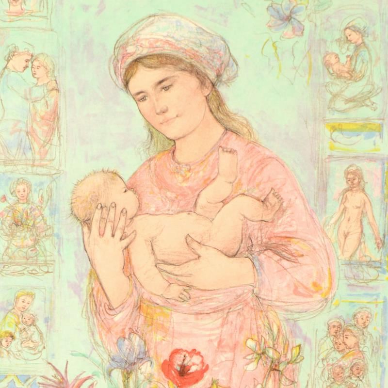 "Raquela" is a limited edition lithograph on rice paper by Edna Hibel (1917-2014), numbered and hand signed by the artist. Includes Certificate of Authenticity. Measures approx. 26.5" x 37.5" (border), 23" x 33" (image).