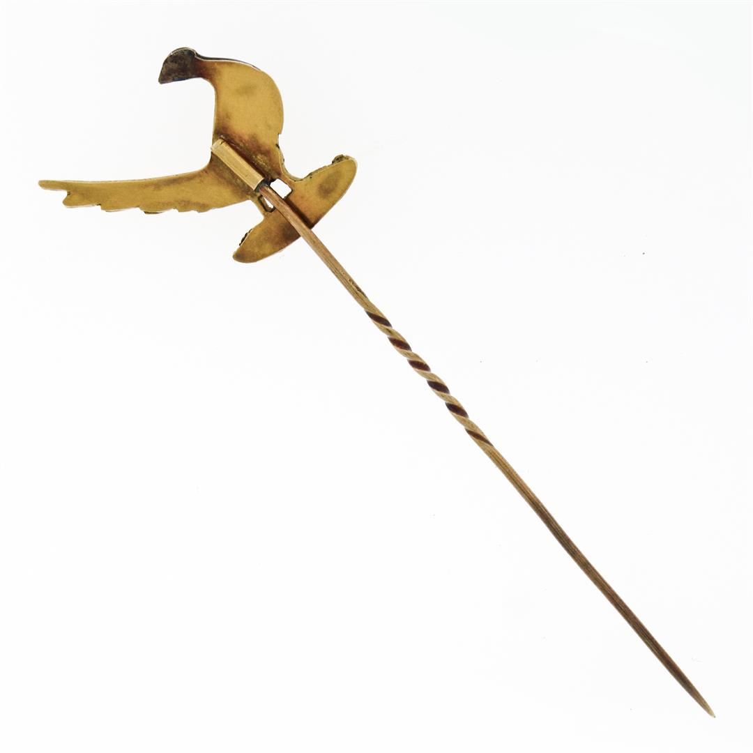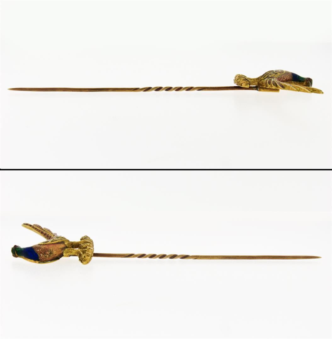 A rare, art nouveau period, solid 18k yellow gold detailed pheasant stick pin brooch featuring 1 round cabochon cut natural ruby (0.03ct) in addition to green and blue enamel work. Measures 94.25x29.55mm and weighs a total of 8.18 grams.