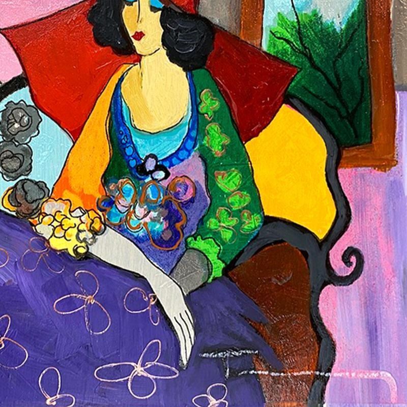 "Red Hat" is a one-of-a-kind mixed media over paint on wood by Itzchak Tarkay (1935-2012), hand signed by the artist. Includes Letter of Authenticity. Measures approx. 9" x 12" (image).