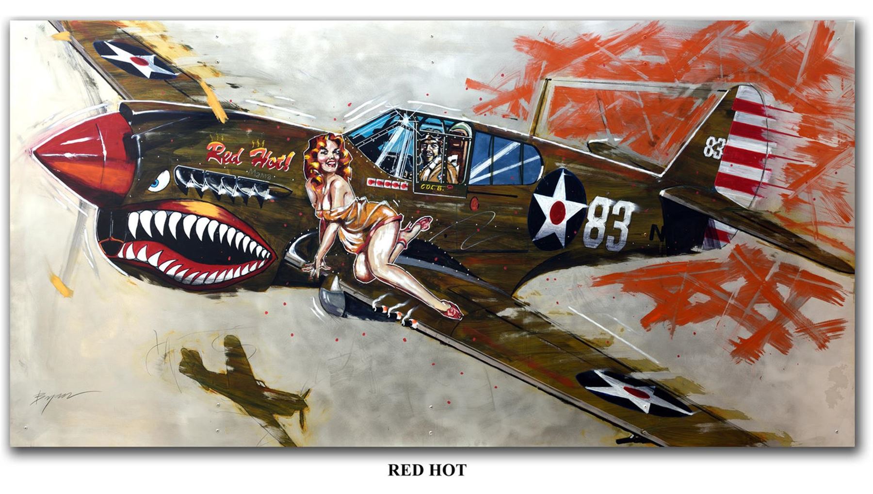 Red Hot is the attitude this WWII fighter pilot took into battle with his pin-up girl on the fuselage. This is a 20x40" Unique 1/1 handworked giclee on canvas .