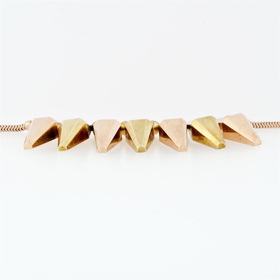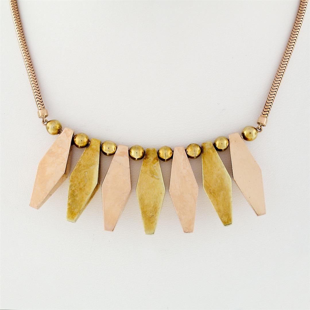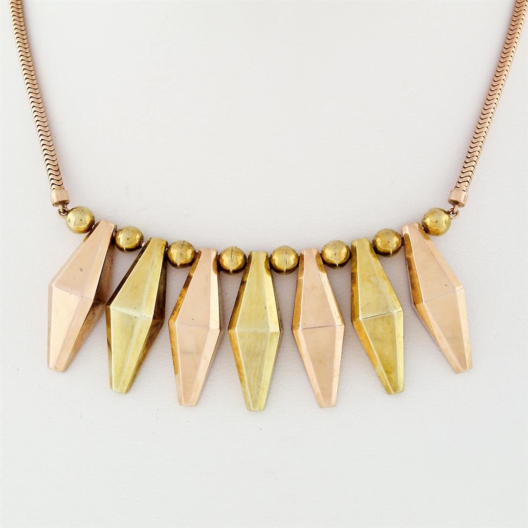A vintage solid 14k green and rose gold marquise fringe necklace. 14.5 inch snake link chain, 32.05 grams total weight, pendant measures 27.17mm in height.