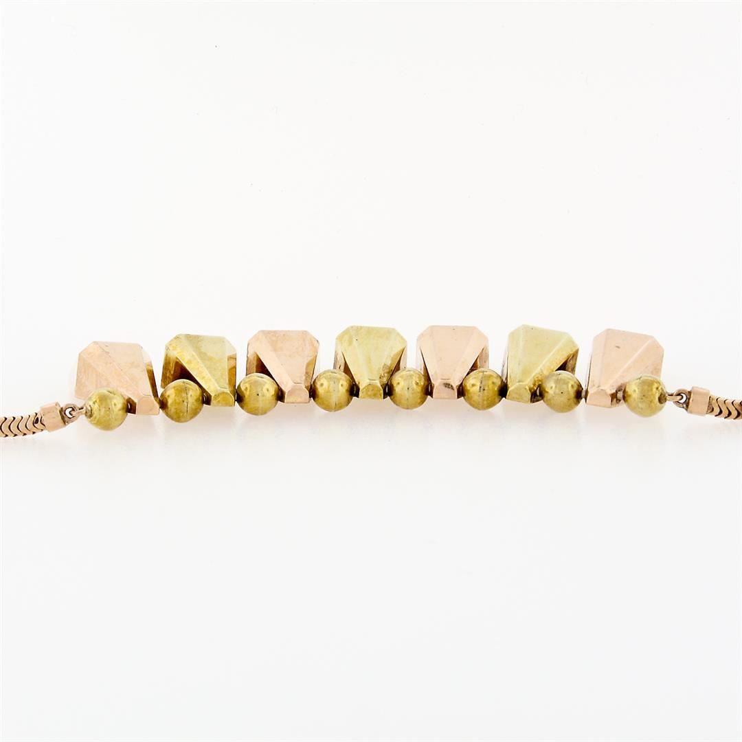 A vintage solid 14k green and rose gold marquise fringe necklace. 14.5 inch snake link chain, 32.05 grams total weight, pendant measures 27.17mm in height.