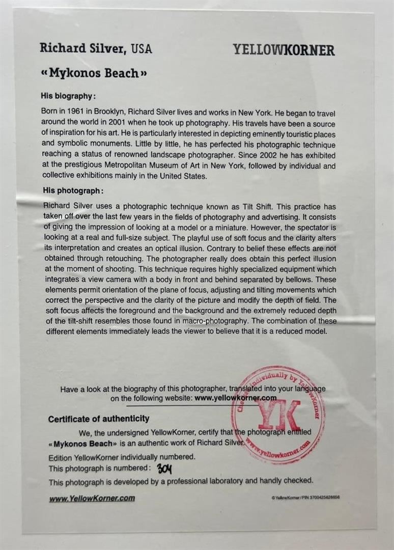 Richard Silver Mykonos Beach, Greece YellowKorner Certified Photograph. Certificate of Authenticity from YellowKorner affixed to the back. Matted Dimensions 16"x20". Protected with Clear Mylar Sleeve.