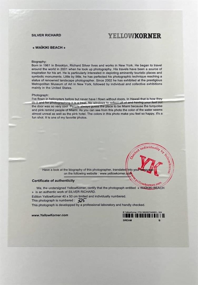 Richard Silver Waikiki Beach YellowKorner Certified Photograph. Certificate of Authenticity from YellowKorner affixed to the back. Matted Dimensions 16"x20". Protected with Clear Mylar Sleeve.