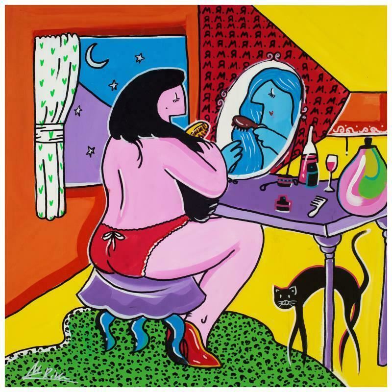 "Mirror Mirror" is an Original acrylic painting on Canvas by Rina Maimon. The piece comes hand signed and is accompanied by a Certificate of Authenticity. Measures approximately: 24" x 24".