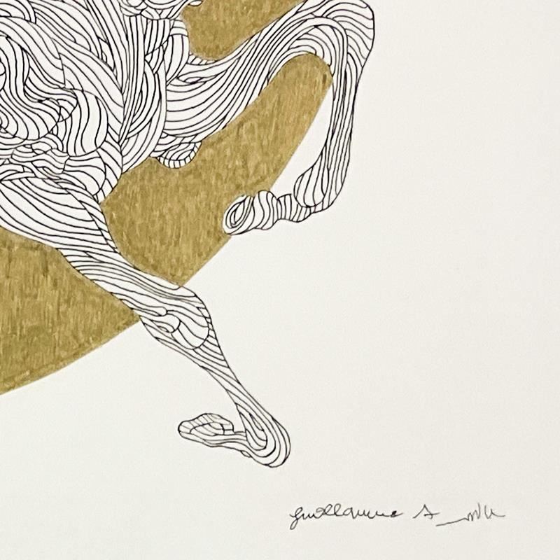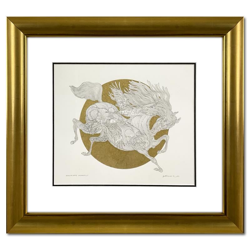 "Rising Sun Sketch GOA" is an original drawing on paper with hand laid gold leaf by Guillaume Azoulay, hand signed by the artist. This piece comes custom framed. Includes Letter of Authenticity. Measures approx. 24" x 22" (frame), 11.5" x 10" (image).