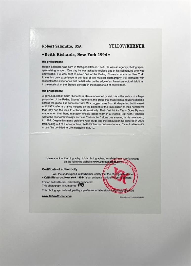 Robert Salandro Keith Richards New York YellowKorner Certified Photograph. Certificate of Authenticity from YellowKorner affixed to the back. Matted Dimensions 16"x20". Protected with Clear Mylar Sleeve.