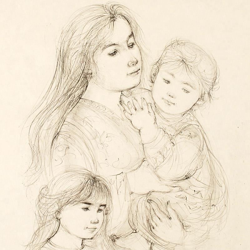 Wild lines and muted colors make Edna Hibel's art stand out in any room. "Robert with Mother and Sister" is a limited edition lithograph on paper, numbered and hand signed by Hibel (1917-2014). Includes Certificate of Authenticity! Measures approx. 22" x 30" (with border), 16" x 22" (image).