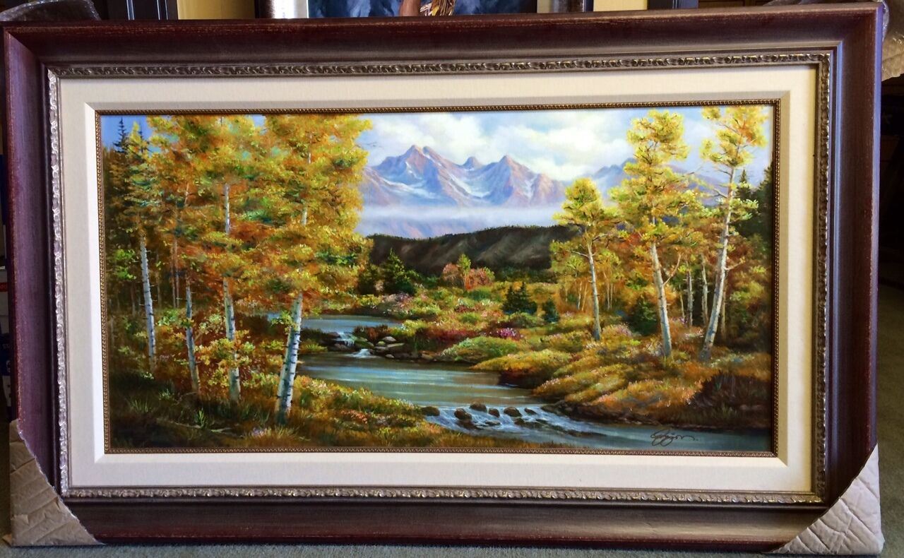 Peruvian artist Bocci created this 24x48" oil on canvas. It is a 30x54" framed landscape of the Rocky Mountains outside Aspen Colorado