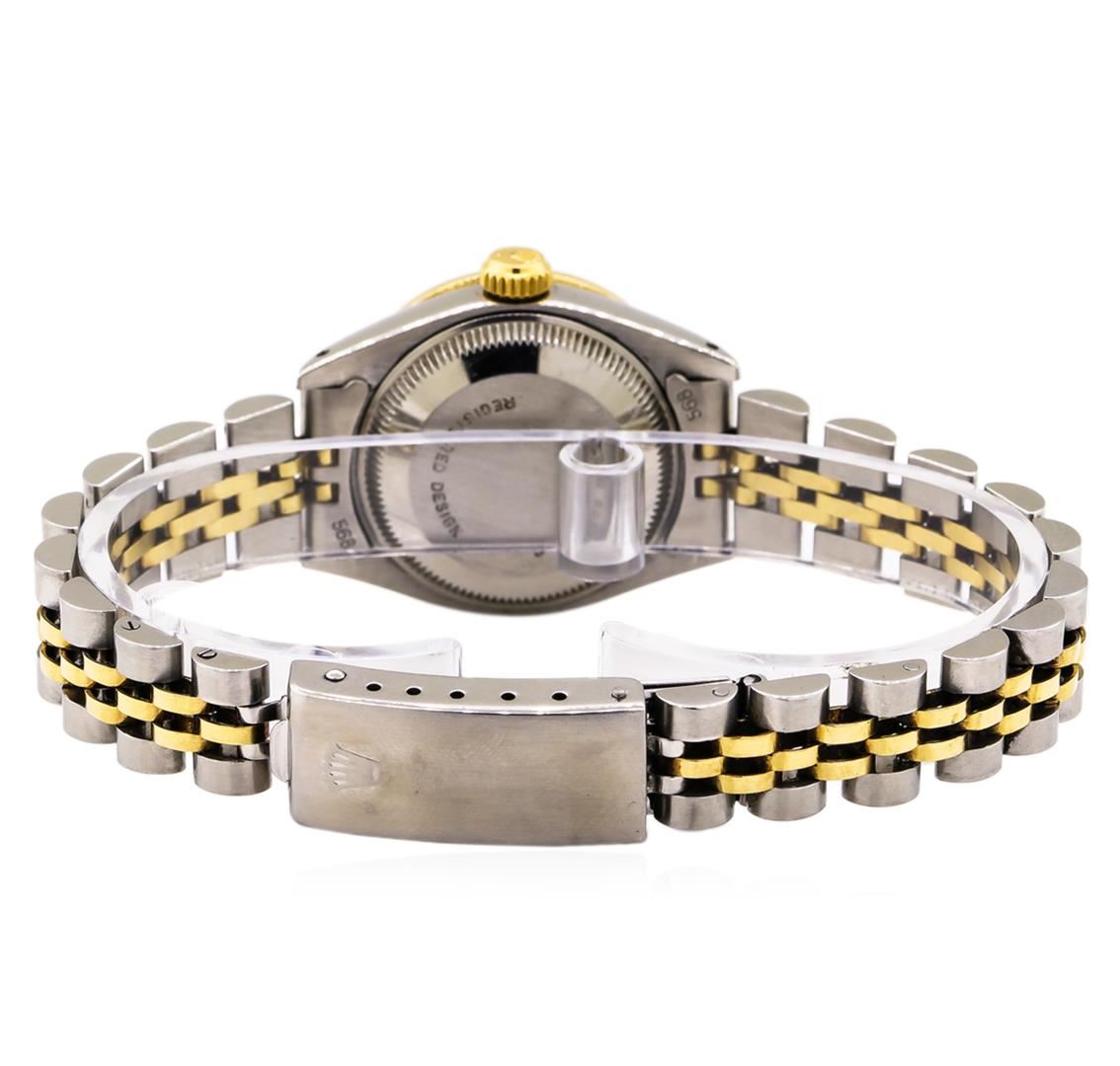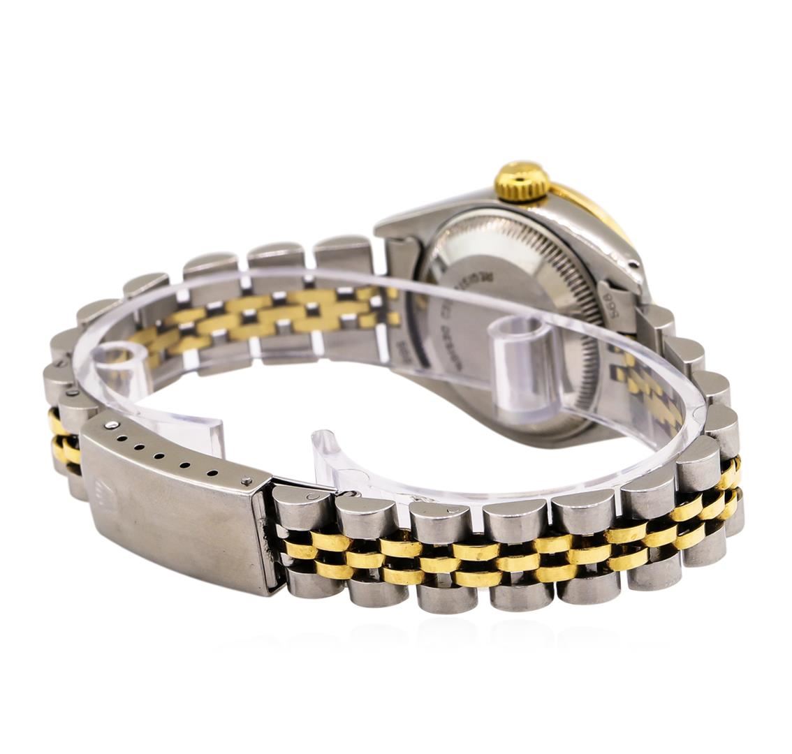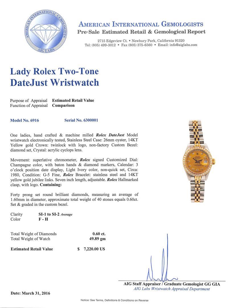 One ladies, hand crafted & machine milled Rolex DateJust Model wristwatch electronically tested, Stainless Steel Case: 26mm oyster, 14KT Yellow gold Crown: twinlock with logo, non-factory Custom Bezel: diamond set, Crystal: acrylic cyclops lens. Movement: superlative chronometer, Rolex signed Customized Dial: Champagne color, with baton hands & diamond markers, Calendar: 3 o'clock position date display, Light Ivory color, non-quick set, Circa: 1980, Condition: G-5 Fine, Rolex Bracelet: stainless steel and 14KT yellow gold jubilee links. Seven inch length, adjustable. Rolex Hallmarked clasp, with logo. Containing: Forty prong set round brilliant diamonds, measuring an average of 1.60mm in diameter, approximate total weight of 40 stones equals 0.60ct. Set & graded in the custom bezel. Clarity: SI-1 to SI-2 Average. Color: F - H. Total Weight of Diamonds 0.60ct. Total Weight of Watch 49.89gm. AIG Appraised.