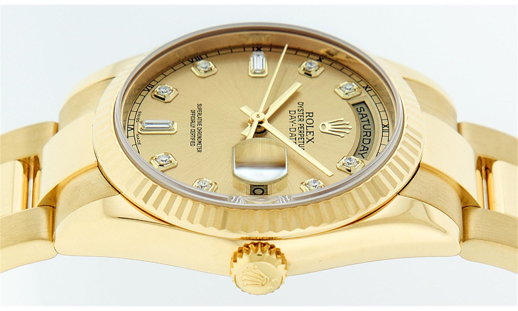 One Mens 18K Yellow Gold Rolex Day Date President Polished, Serviced & Electronically Tested, 18K Yellow Gold Case:36mm, Bezel: 18K Yellow Gold Fluted Bezel. Crystal: Synthetic Sapphire Cyclops Lens. Movement: Automatic Winding Movement Caliber 3155. Dial: Champagne Diamond & Baguette Dial, (8 Diamond + 2 Baguette Diamonds In Dial) E In Color, Clarity: VS. Date Window: 3 O'Clock Position Date Display, Day Display: 12 O'Clock Position. Double Quickset, Model: 118238. Condition: G-6 Extra Fine. Bracelet: Yellow Gold Oyster Band President Band. Bright Polish. 7.0 Inch Length, Standard Oyster Band President Clasp, With Rolex Logo. Comes With Box & Papers. Comes with 6 month warranty.