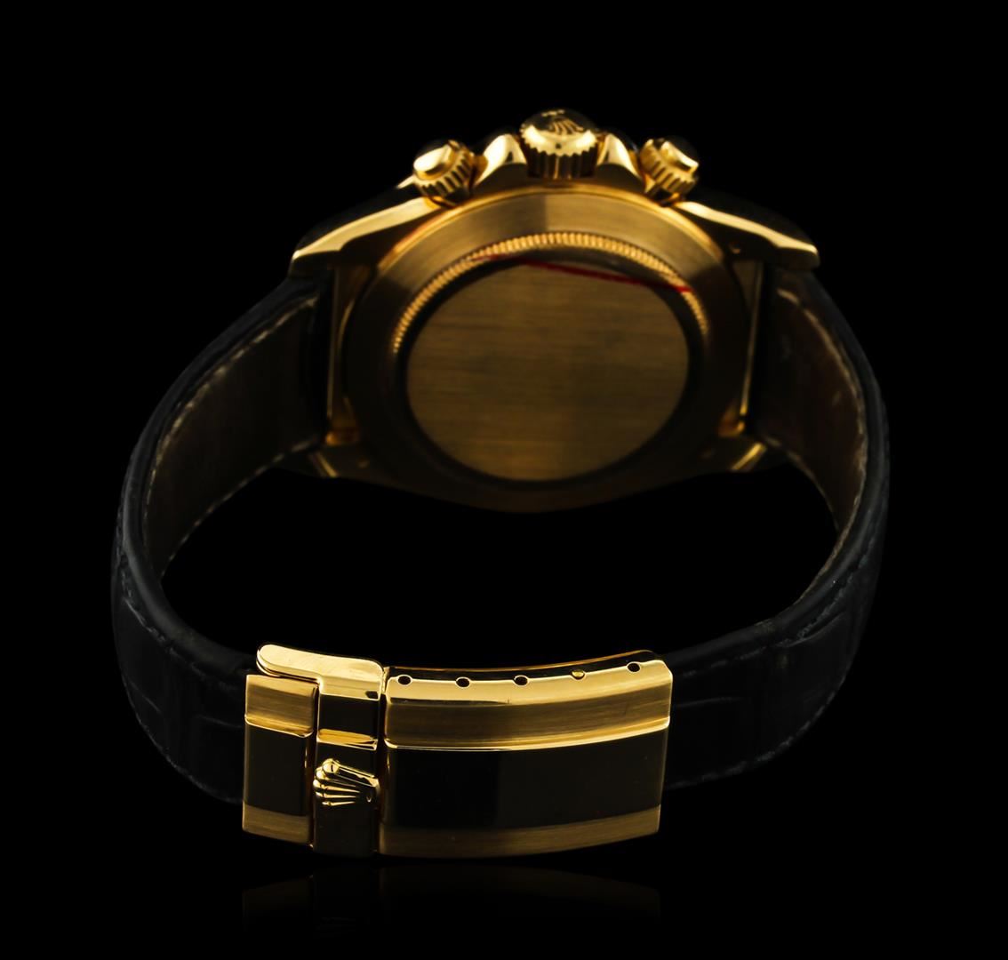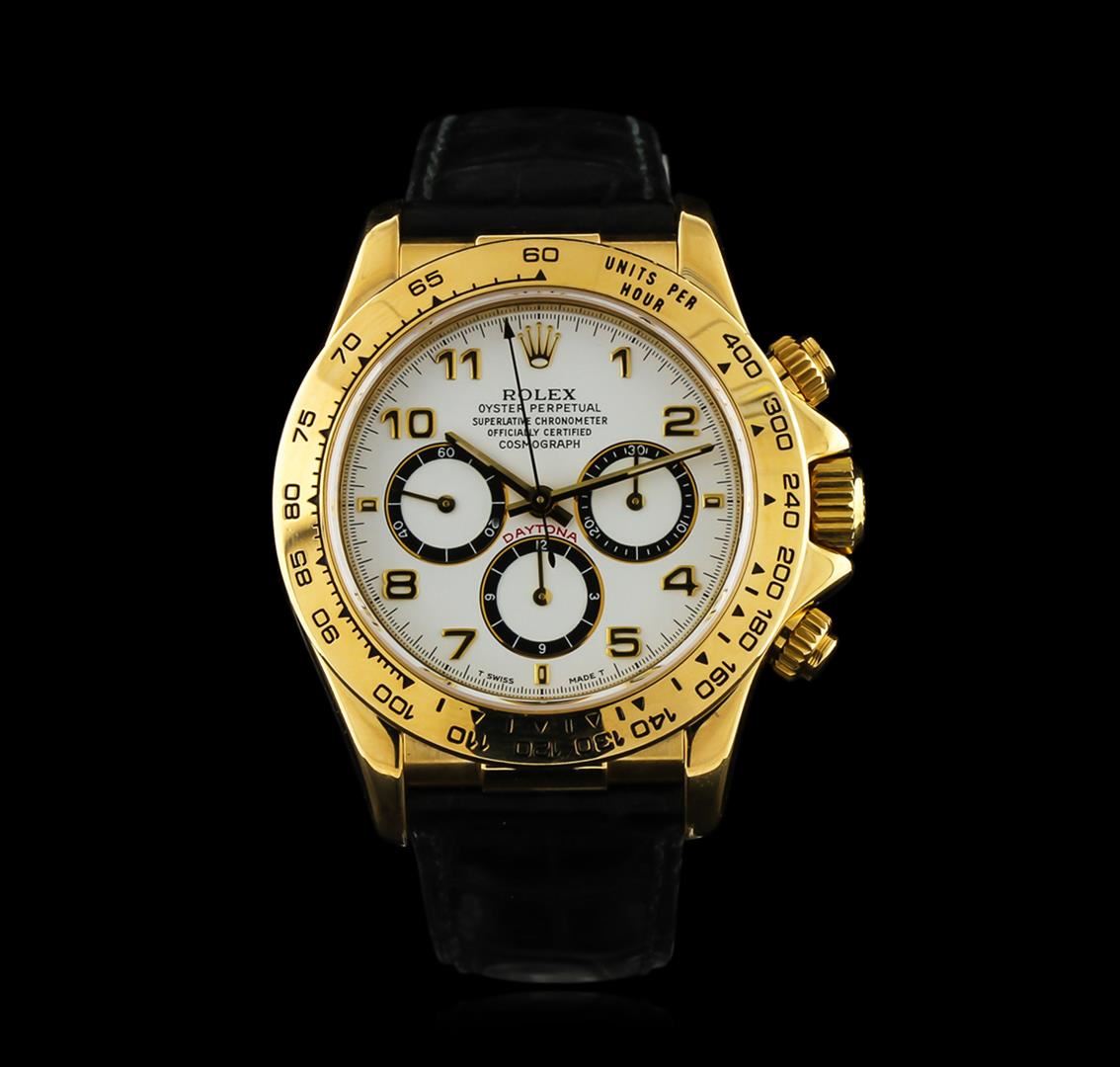 One gents, hand crafted & machine milled Rolex 18KT Yellow gold Daytona Cosmograph wristwatch electronically tested, Swiss Hallmarked Case: 40mm oyster, Crown: twin lock with logo, set within protective shoulders, Bezel: fixed, with engraved Tachymeter scale, Crystal: synthetic sapphire lens. Movement: superlative chronometer, Dial: Porcelain White, with baton hands, & numerals, Sub Dials: Black ringed white chronograph sub dials at the 3 and 9 o'clock positions; continuous seconds sub dial at the 6 o'clock position, Bracelet: Black saddle stitched leather strap completed by an 18KT Yellow gold (Swiss Hallmarked) deployment flip lock clasp with logo, Condition: G-6 extra fine. Circa: 1992, Seven and one half inch length, adjustable. Total Weight of Watch140.68gm. AIG Appraised at $22,000.00.