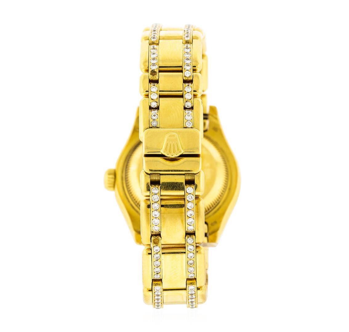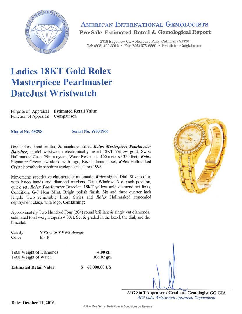 One ladies, hand crafted & machine milled Rolex Masterpiece Pearlmaster DateJust, model wristwatch electronically tested 18KT Yellow gold, Swiss Hallmarked Case: 29mm oyster, Water Resistant: 100 meters / 330 feet, Rolex Signature Crown: twinlock, with logo, Bezel: diamond set, Rolex Hallmarked Crystal: synthetic sapphire cyclops lens. Circa 1995.Movement: superlative chronometer automatic, Rolex signed Dial: Silver color, with baton hands and diamond markers, Date Window: 3 o'clock position, quick set, Rolex Pearlmaster Bracelet: 18KT yellow gold diamond set links, Condition: G-7 Near Mint. Bright polish finish. Six and three quarter inch length. Two removable links. Swiss and Rolex Hallmarked concealed deployment clasp, with logo. Containing: Approximately Two Hundred Four (204) round brilliant & single cut diamonds, estimated total weight equals 4.00ct. Set & graded in the bezel, the dial, and the bracelet. Clarity VVS-1 to VVS-2 Average Color E - F. Total Weight of Diamonds 4.00ct. Total Weight of Watch 106.02gm. AIG Appraised at $60,000.00.