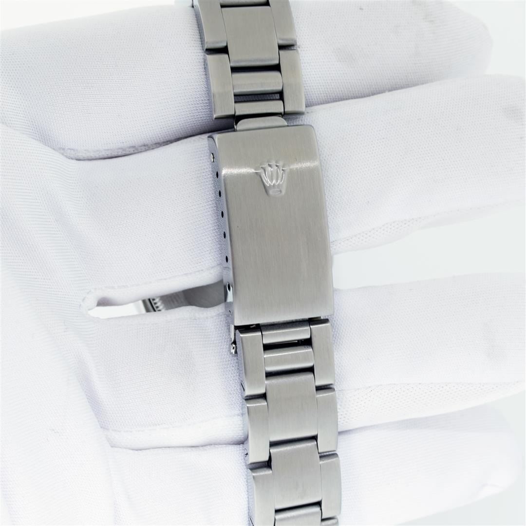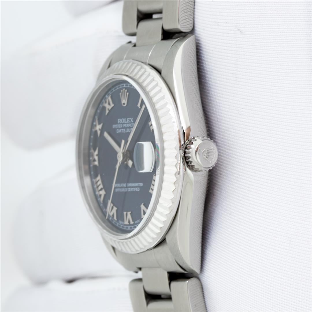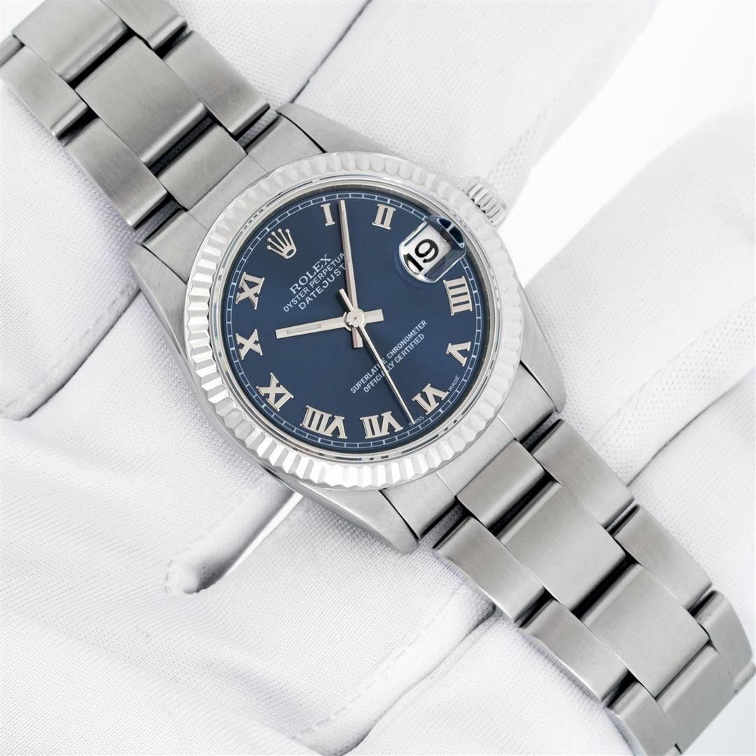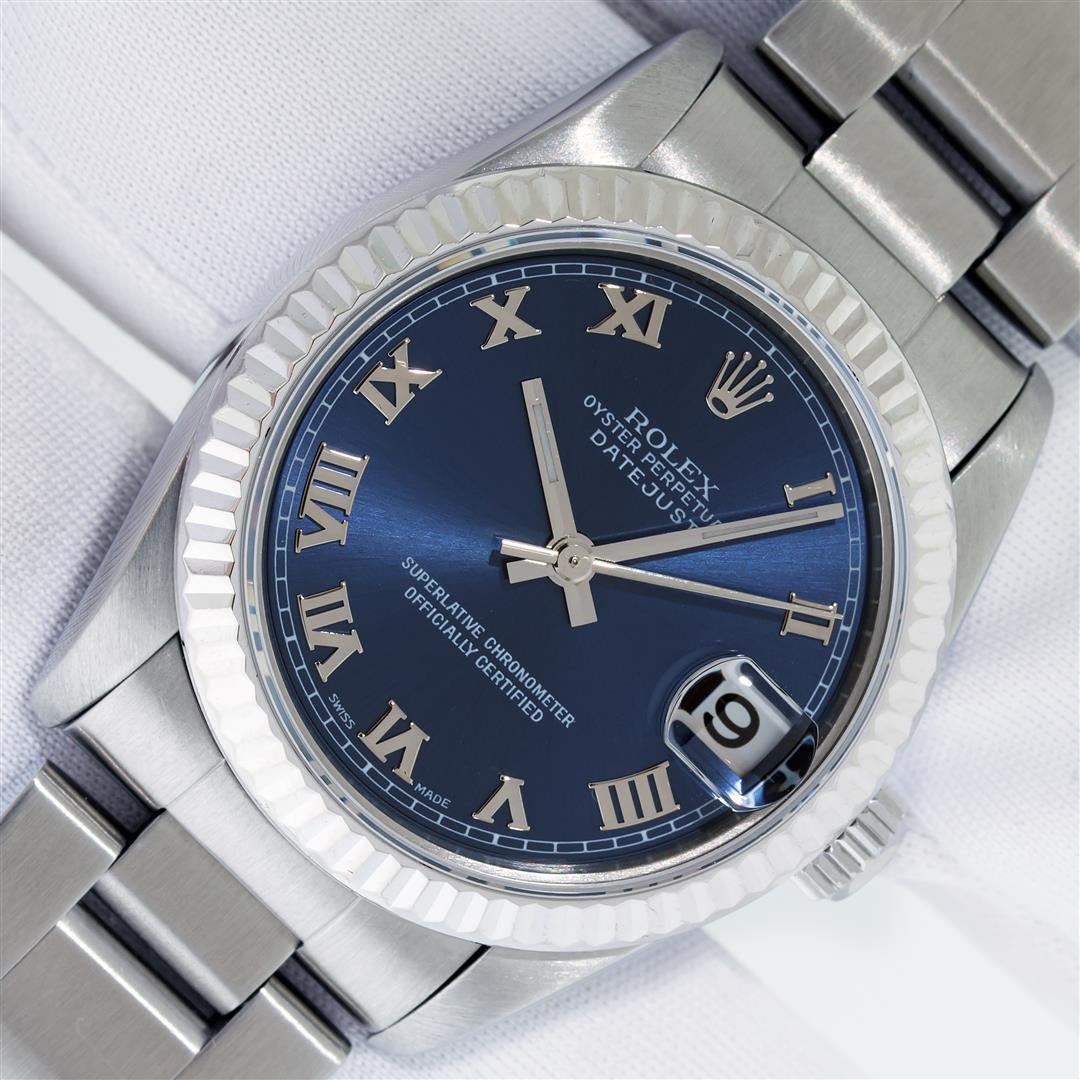 One Women's Pre Owned Midsize 31MM Stainless Steel Rolex Datejust Polished, Serviced & Electronically Tested, Rolex Stainless Steel Case Case: 31mm, Rolex Stainless Steel Crown, Rolex Bezel: 18K White Gold Fluted Bezel, Crystal: Sapphire With Cyclops Lens. Hands: Lumi Hands. Rolex Movement: Automatic Winding Movement 2235. Rolex Dial: Blue With Roman Hour Markers. Date Window: 3 O'Clock Position Date Display, Quickset, Model: Midsize Datejust. Condition: G-6 Extra Fine. Rolex Bracelet: Stainless Steel Oyster Band. Bright Polish. 6.0 Inch Length, Adjustable. Standard Clasp, With Rolex Logo. This Watch Has Been Serviced Time Tested And Is In Excellent Condition It Is Free Of All Scratches And Dents.