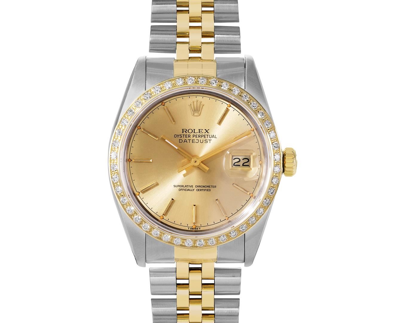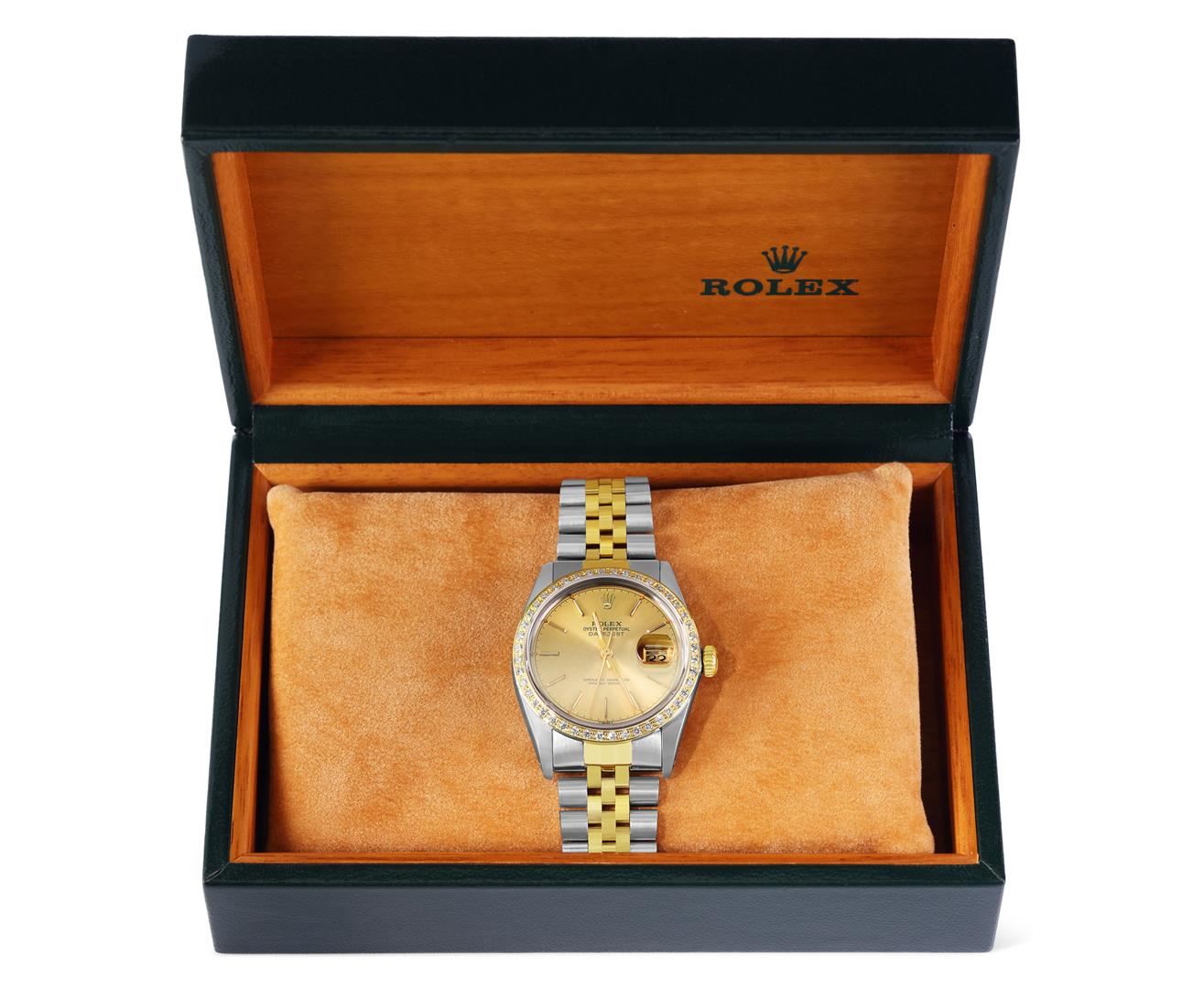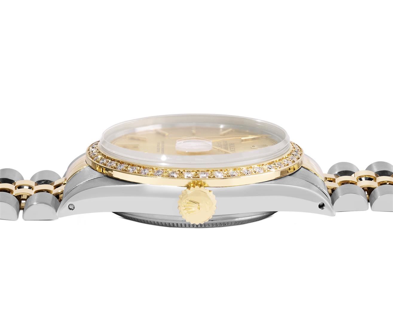 One Mens Pre Owned Yellow Gold And Steel Two Tone Rolex Datejust Polished, Serviced & Electronically Tested, Rolex Yellow Gold & Stainless Steel Case: 36mm, Rolex Yellow Gold Crown, Custom Bezel: New 18K Yellow Gold Beadset Diamond Bezel, Diamond Count: 44 Diamonds, Clarity: SI-VS, Color: G to H. Custom Crystal: New Sapphire With Magnified Date Window. Custom Hands: New Luminecent Hands. Rolex Movement: Automatic Winding Movement 3035. Rolex Dial: Champagne Dial With Index Hour Markers and Dash Track With Lumi Dots. Date Window: 3 O'Clock Position Date Display, Quickset, Model: Quickset Datejust. Condition: G-6 Extra Fine. Rolex Bracelet: Two Tone Yellow Gold & Stainless Steel Jubilee Band. Bright Polish. 7.0 Inch Length, Adjustable. Fold Clasp, With Rolex Logo. This Watch Has Been Serviced Time Tested And Is In Excellent Condition It Is Free Of All Scratches And Dents.