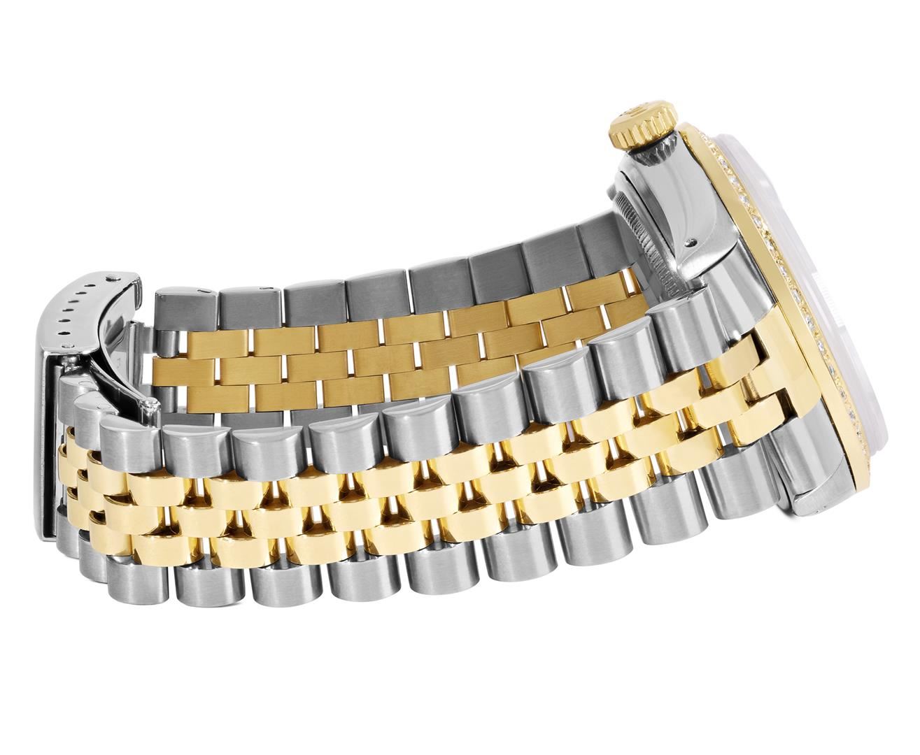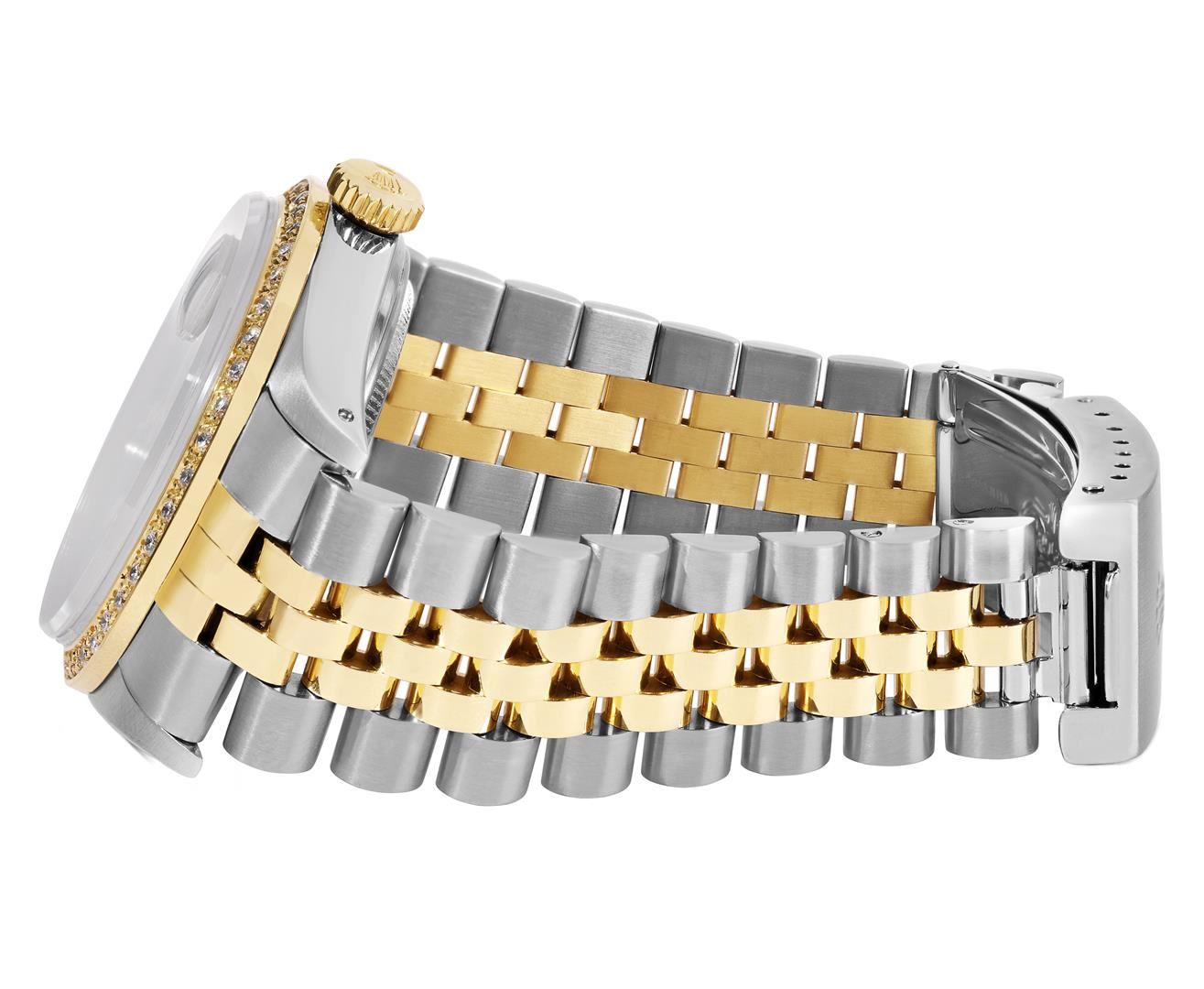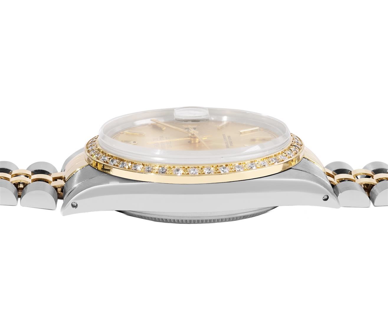 One Mens Pre Owned Yellow Gold And Steel Two Tone Rolex Datejust Polished, Serviced & Electronically Tested, Rolex Yellow Gold & Stainless Steel Case: 36mm, Rolex Yellow Gold Crown, Custom Bezel: New 18K Yellow Gold Beadset Diamond Bezel, Diamond Count: 44 Diamonds, Clarity: SI-VS, Color: G to H. Custom Crystal: New Sapphire With Magnified Date Window. Custom Hands: New Luminecent Hands. Rolex Movement: Automatic Winding Movement 3035. Rolex Dial: Champagne Dial With Index Hour Markers and Dash Track With Lumi Dots. Date Window: 3 O'Clock Position Date Display, Quickset, Model: Quickset Datejust. Condition: G-6 Extra Fine. Rolex Bracelet: Two Tone Yellow Gold & Stainless Steel Jubilee Band. Bright Polish. 7.0 Inch Length, Adjustable. Fold Clasp, With Rolex Logo. This Watch Has Been Serviced Time Tested And Is In Excellent Condition It Is Free Of All Scratches And Dents.