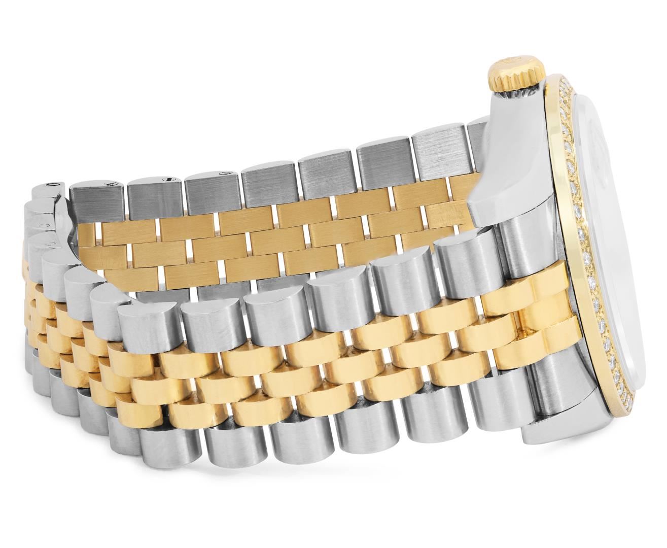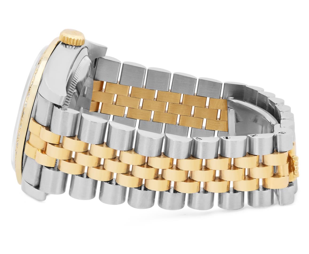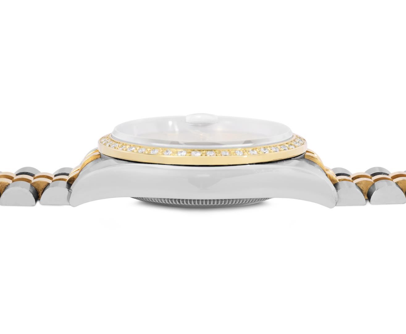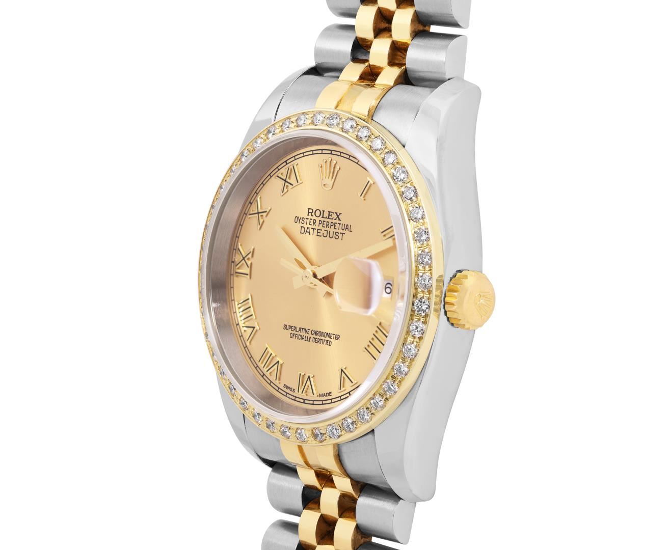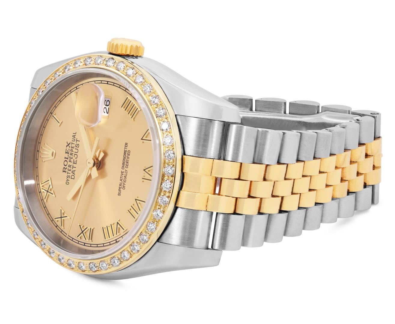 One Mens Pre Owned Quickset Sapphire 18K Yellow Gold And Stainless Steel Rolex Datejust 36MM Polished, Serviced And Electronically Tested, Rolex Yellow Gold And Stainless Steel Case: 36mm, Rolex Yellow Gold Crown, Custom Bezel: New 18K Yellow Gold Beadset Diamond Bezel, Diamond Count: 44 Diamonds. Crystal: Sapphire With Magnified Date Window. Hands: Solid Hands. Rolex Movement: Automatic Winding Movement 3135. Rolex Dial: Factory Champagne Dial With Roman Hour Markers. Date Window: 3 O'Clock Position Date Display, Quickset, Model: 116233 Datejust. Condition: G-6 Extra Fine. Rolex Bracelet: Two Tone 18K Yellow Gold And Stainless Steel Jubilee Band. Bright Polish. 7.0 Inch Length, Adjustable. Hidden Clasp, With Rolex Logo. This Watch Has Been Serviced And Polished It Is Free Of All Scratches And Dents. This Watch Comes With A Role Box.