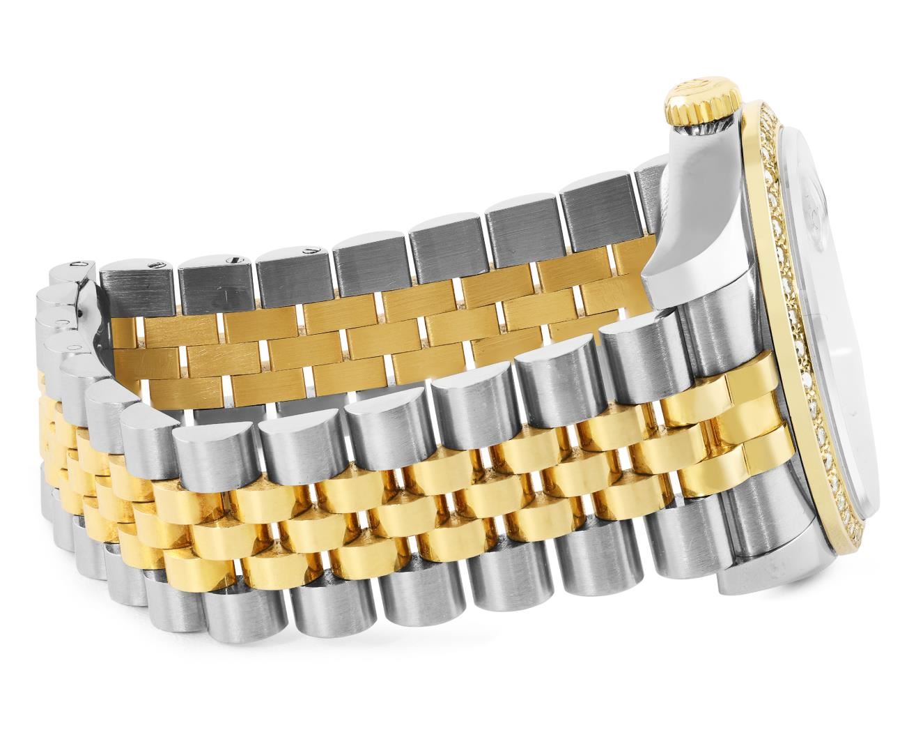 One Mens Pre Owned Quickset Sapphire 18K Yellow Gold And Stainless Steel Rolex Datejust 36MM Polished, Serviced And Electronically Tested, Rolex Yellow Gold And Stainless Steel Case: 36mm, Rolex Yellow Gold Crown, Custom Bezel: New 18K Yellow Gold Beadset Diamond Bezel, Diamond Count: 44 Diamonds. Crystal: Sapphire With Magnified Date Window. Hands: Solid Hands. Rolex Movement: Automatic Winding Movement 3135. Rolex Dial: Factory Cream Dial Arabic Hour Markers. Date Window: 3 O'Clock Position Date Display, Quickset, Model: 116233 Datejust. Condition: G-6 Extra Fine. Rolex Bracelet: Two Tone 18K Yellow Gold And Stainless Steel Jubilee Band. Bright Polish. 7.0 Inch Length, Adjustable. Hidden Clasp, With Rolex Logo. This Watch Has Been Serviced And Polished It Is Free Of All Scratches And Dents. This Watch Comes With A Role Box.
