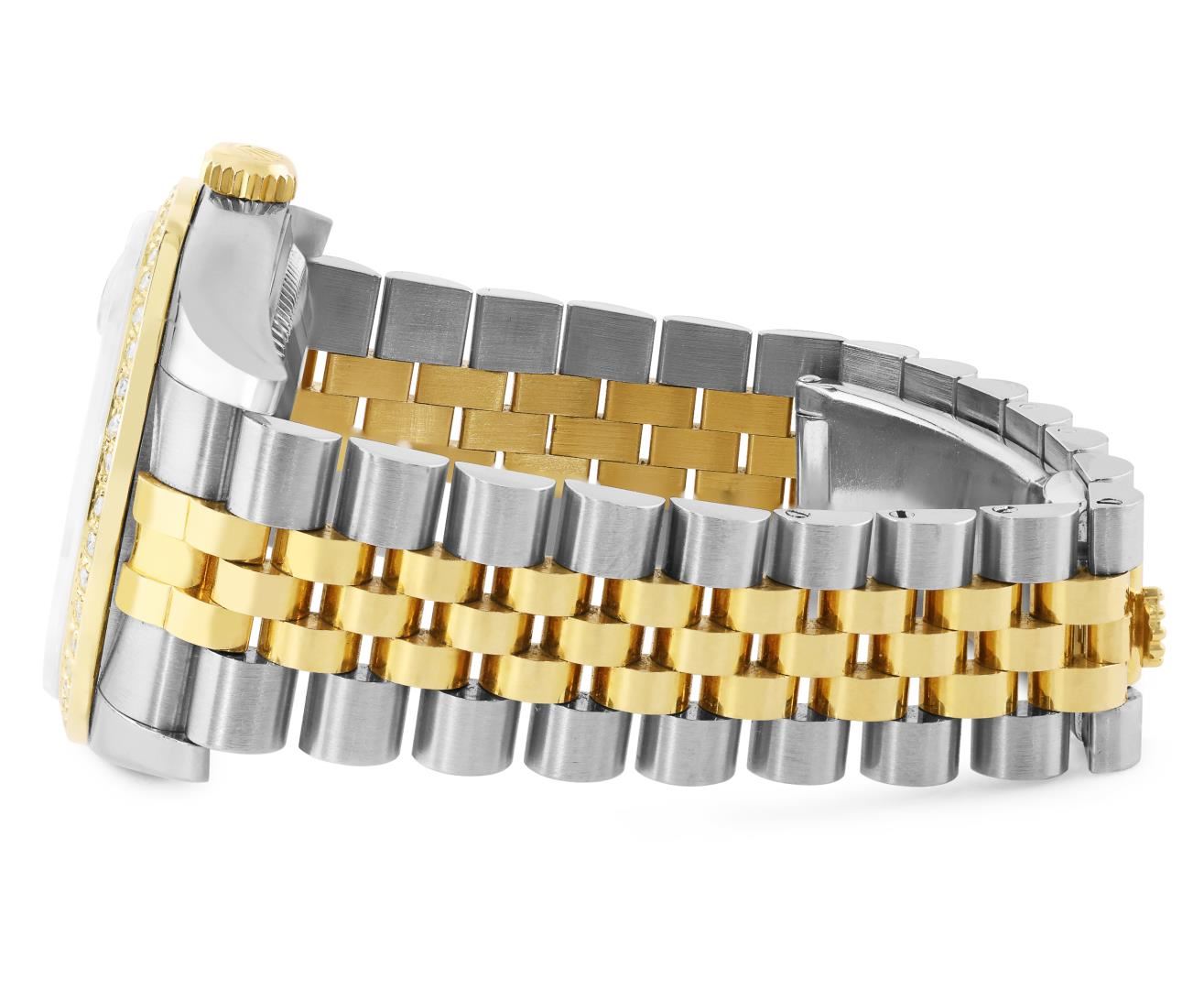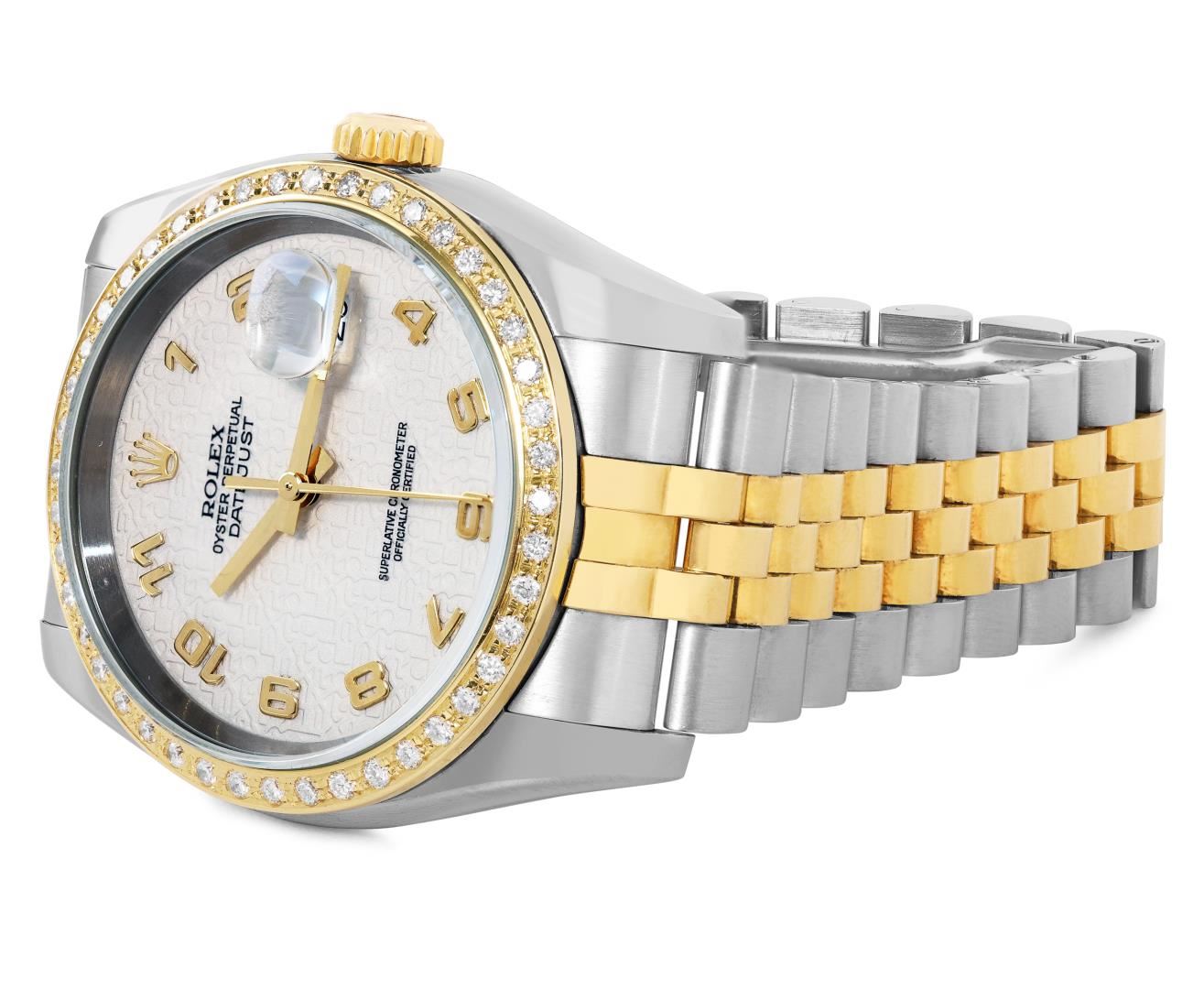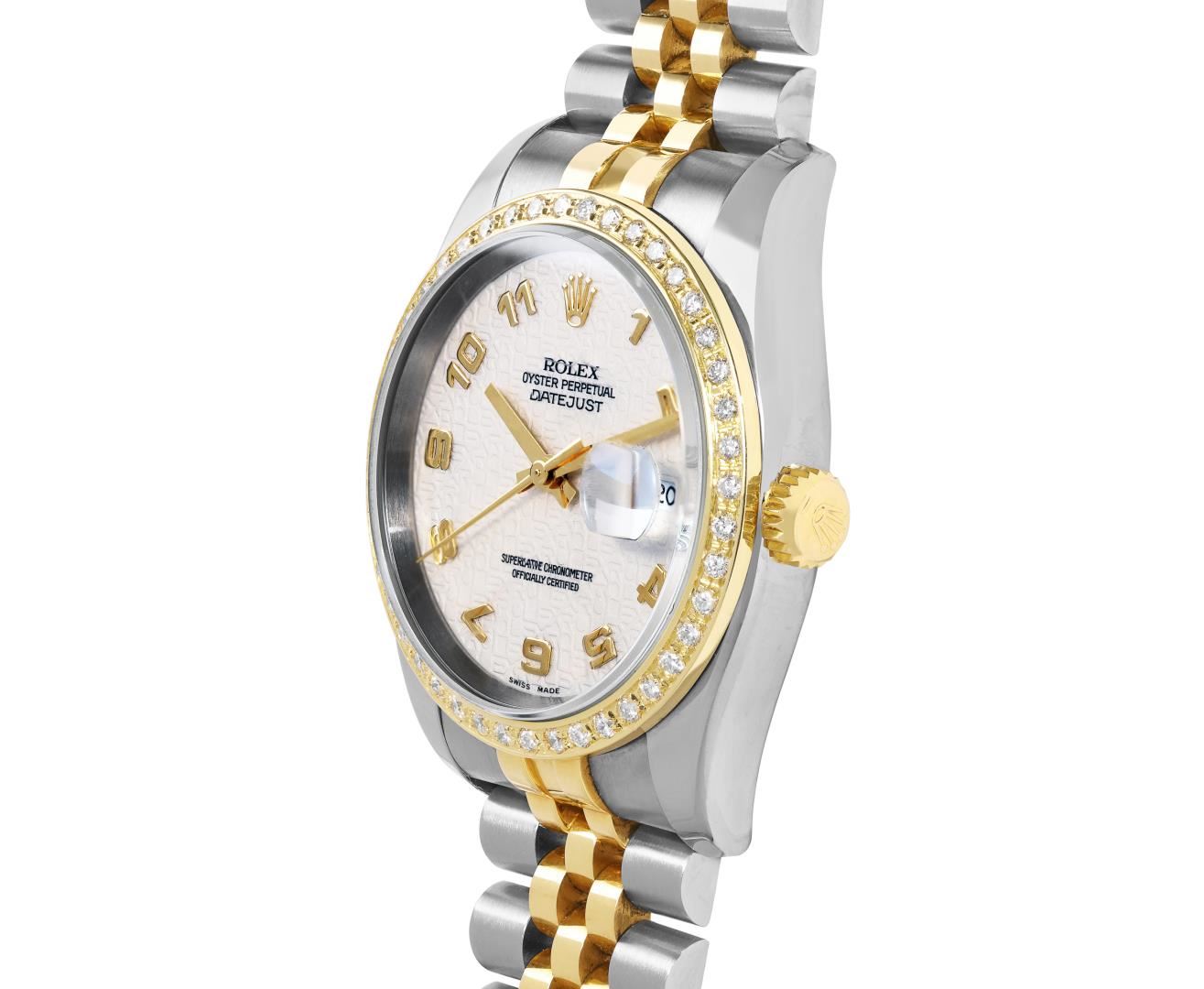 One Mens Pre Owned Quickset Sapphire 18K Yellow Gold And Stainless Steel Rolex Datejust 36MM Polished, Serviced And Electronically Tested, Rolex Yellow Gold And Stainless Steel Case: 36mm, Rolex Yellow Gold Crown, Custom Bezel: New 18K Yellow Gold Beadset Diamond Bezel, Diamond Count: 44 Diamonds. Crystal: Sapphire With Magnified Date Window. Hands: Solid Hands. Rolex Movement: Automatic Winding Movement 3135. Rolex Dial: Factory Cream Dial Arabic Hour Markers. Date Window: 3 O'Clock Position Date Display, Quickset, Model: 116233 Datejust. Condition: G-6 Extra Fine. Rolex Bracelet: Two Tone 18K Yellow Gold And Stainless Steel Jubilee Band. Bright Polish. 7.0 Inch Length, Adjustable. Hidden Clasp, With Rolex Logo. This Watch Has Been Serviced And Polished It Is Free Of All Scratches And Dents. This Watch Comes With A Role Box.