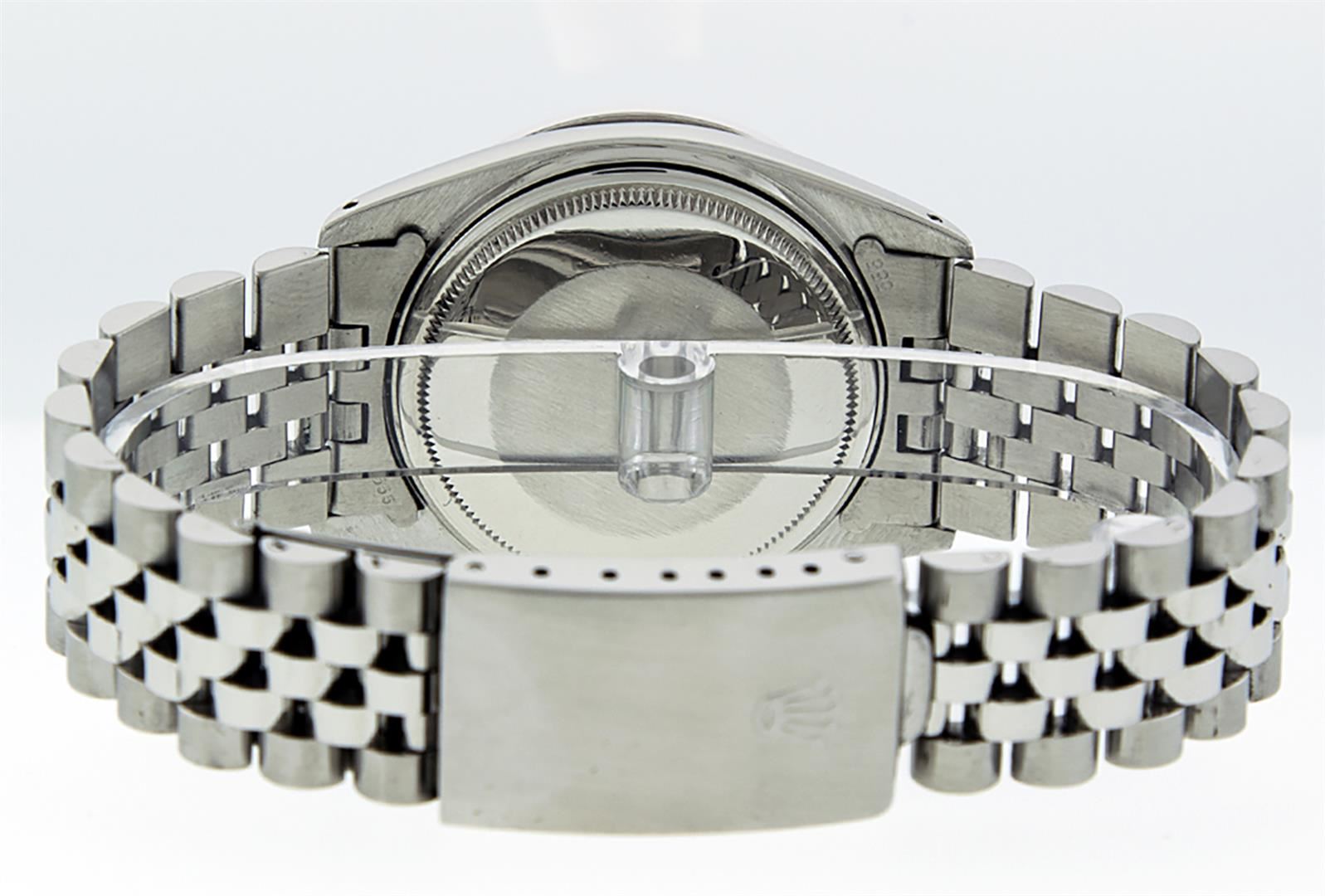One Pre Owned Rolex Stainless Steel 36MM Datejust Polished Bright with Satin Finish, This Watch Has Been Serviced & Electronically Tested, Rolex Stainless Steel Case: 36mm, Rolex Stainless Steel Crown, Custom Bezel: New 18K White Gold Sapphire Beadset Diamond Bezel. Custom Crystal: New Sapphire With Date Window. Custom Hands: New Luminescent Hands. Rolex Movement: Automatic Winding Movement 3035. Custom Dial: Custom Blue Vignette With Added Diamond Hour Markers, Diamond Count: 10 Diamonds in Dial. Date Window: 3 O'Clock Position Date Display, Quickset, Model: Datejust, Condition: G-6 Extra Fine. Rolex Bracelet: Stainless Steel Jubilee Band. Bracelet: 7.0 Inch Length, Adjustable. Fold Clasp, With Rolex Logo. This Watch Has Been Serviced Time Tested And Is In Excellent Condition It Is Free Of All Scratches And Dents.
