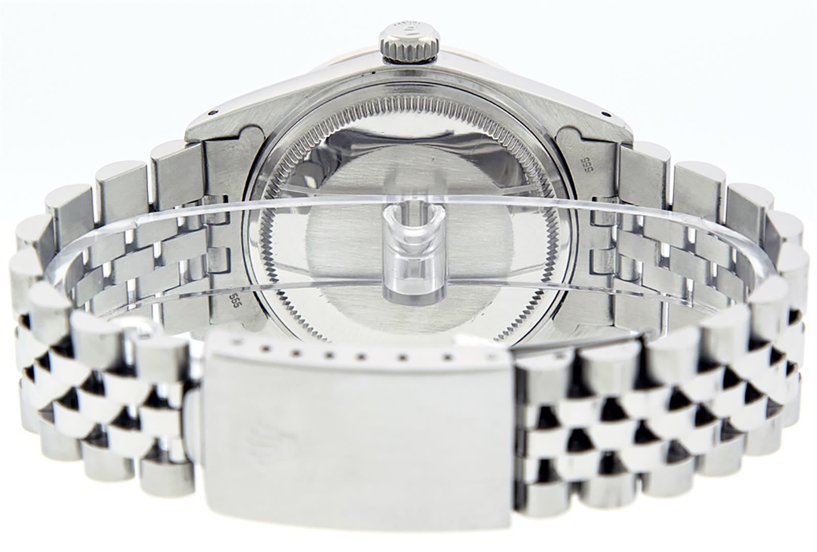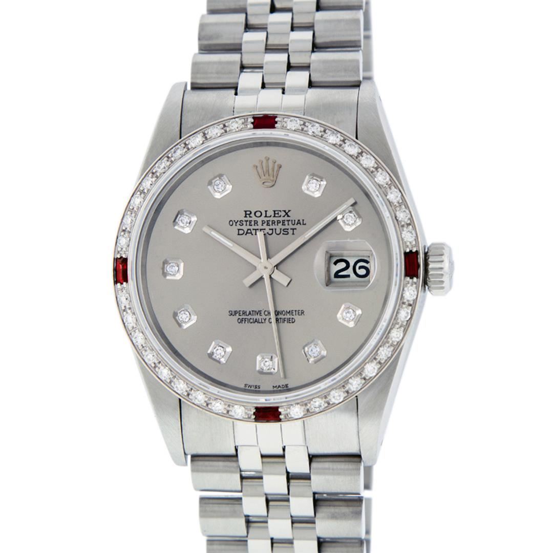 One Pre Owned Stainless Steel Rolex Datejust 36MM Polished Bright with Satin Finish, This Watch Has Been Serviced & Electronically Tested, Rolex Stainless Steel Case: 36mm, Rolex Stainless Steel Crown, Custom Bezel: New 18K White Gold Ruby Beadset Diamond Bezel, Diamond + Gem Count: 36 Diamonds + 4 Rubies. Custom Crystal: New Sapphire With Date Window. Custom Hands: New Luminescent Hands. Rolex Movement: Automatic Winding Movement 3035. Custom Dial: Custom Slate Grey Dial With Added Diamond Hour Markers, Diamond Count: 10 Diamonds in Dial. Date Window: 3 O'Clock Position Date Display, Quickset, Model: Datejust, Condition: G-6 Extra Fine. Rolex Bracelet: Stainless Steel Jubilee Band. Bracelet: 7.0 Inch Length, Adjustable. Standard Clasp, With Rolex Logo. This Watch Has Been Serviced Time Tested And Is In Excellent Condition It Is Free Of All Scratches And Dents.