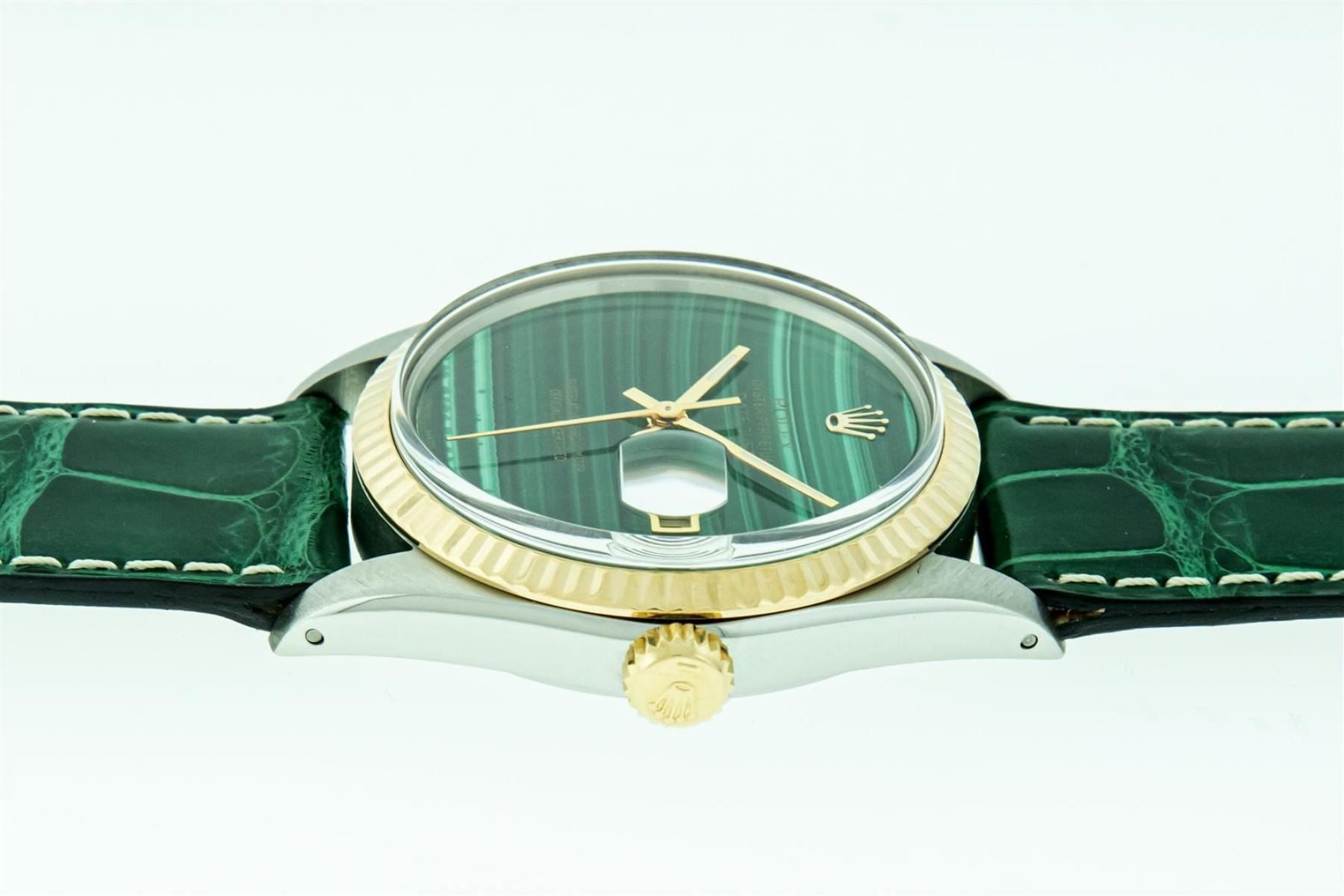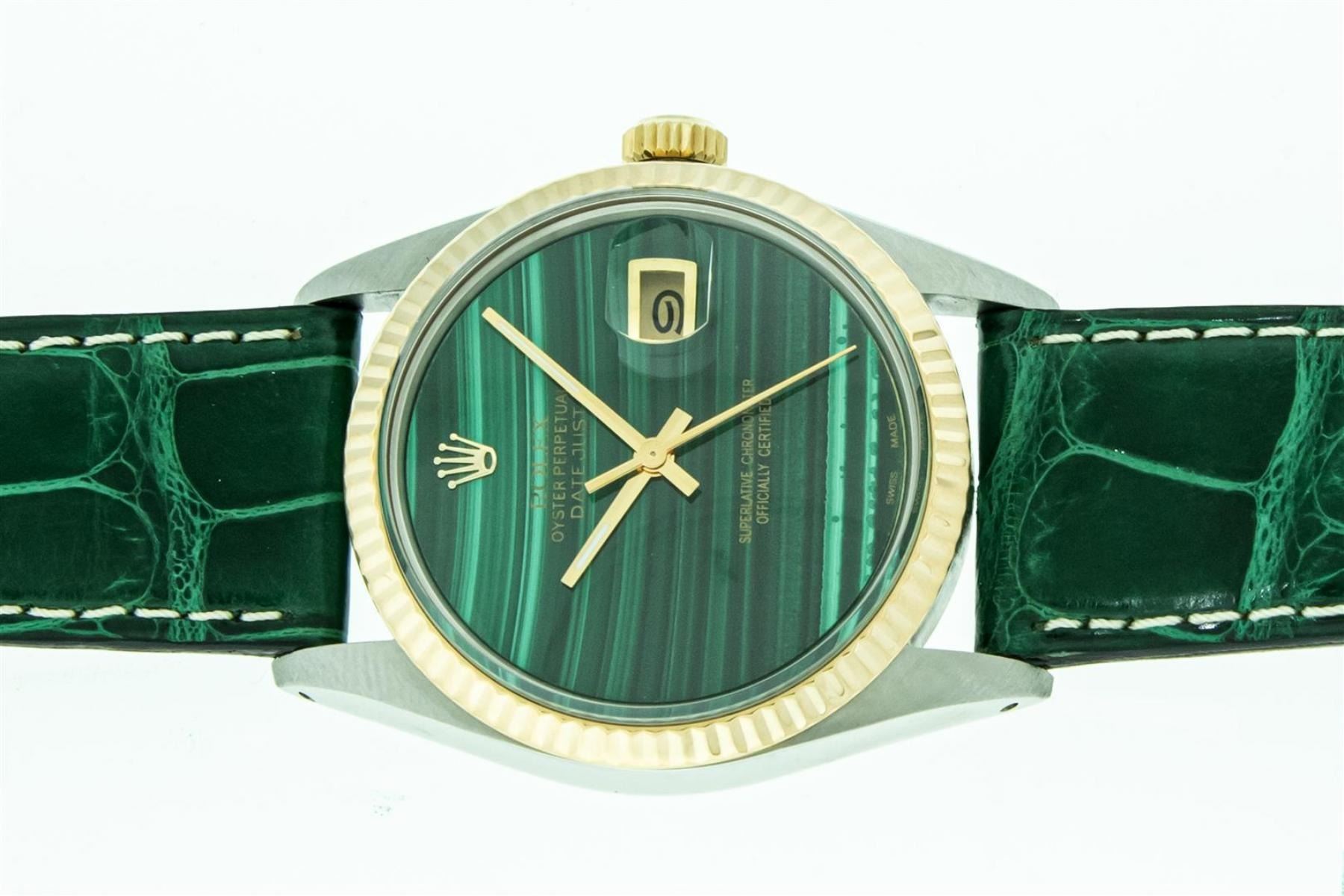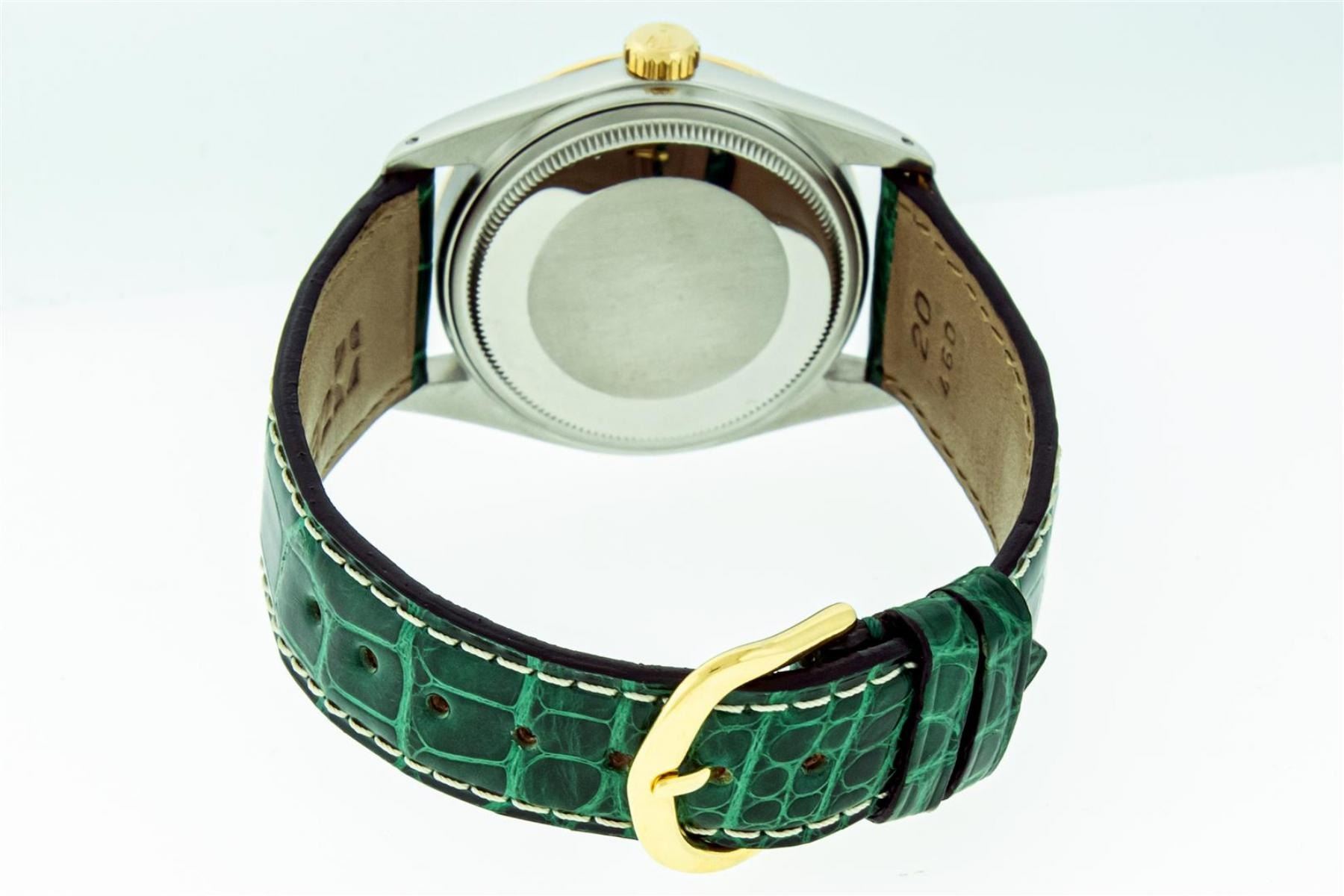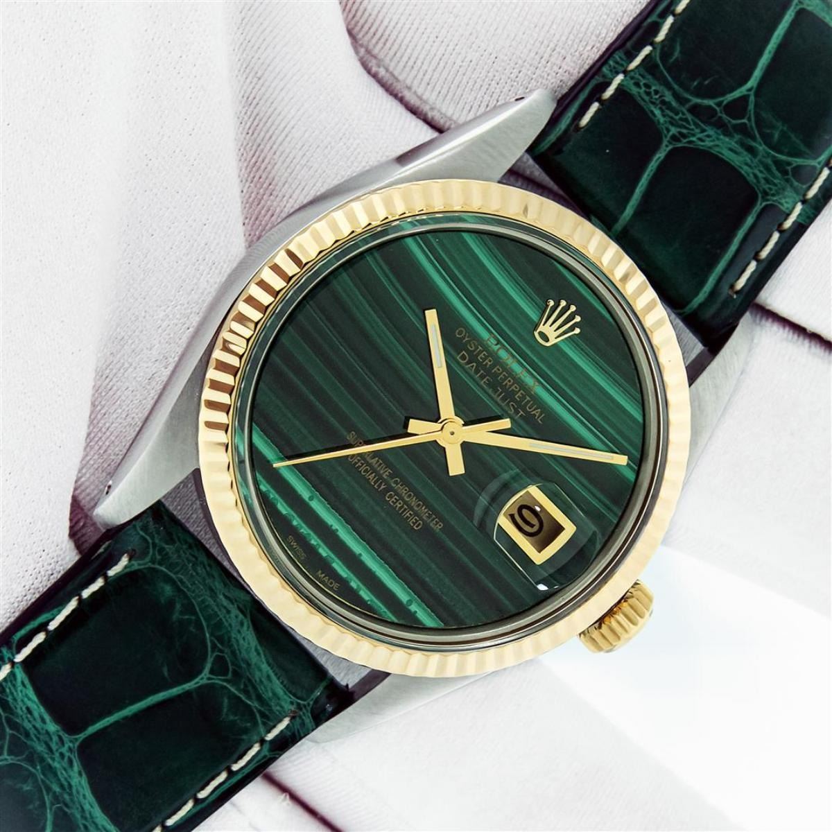 One Mens Yellow Gold Two Tone Rolex Datejust Polished, Serviced & Electronically Tested, Yellow Gold & Stainless Steel Case: 36mm, Yellow Gold Crown, Original Bezel: Yellow Gold Fluted Bezel. Custom Crystal: New Acrylic Crystal With Cyclops Lens. Custom H