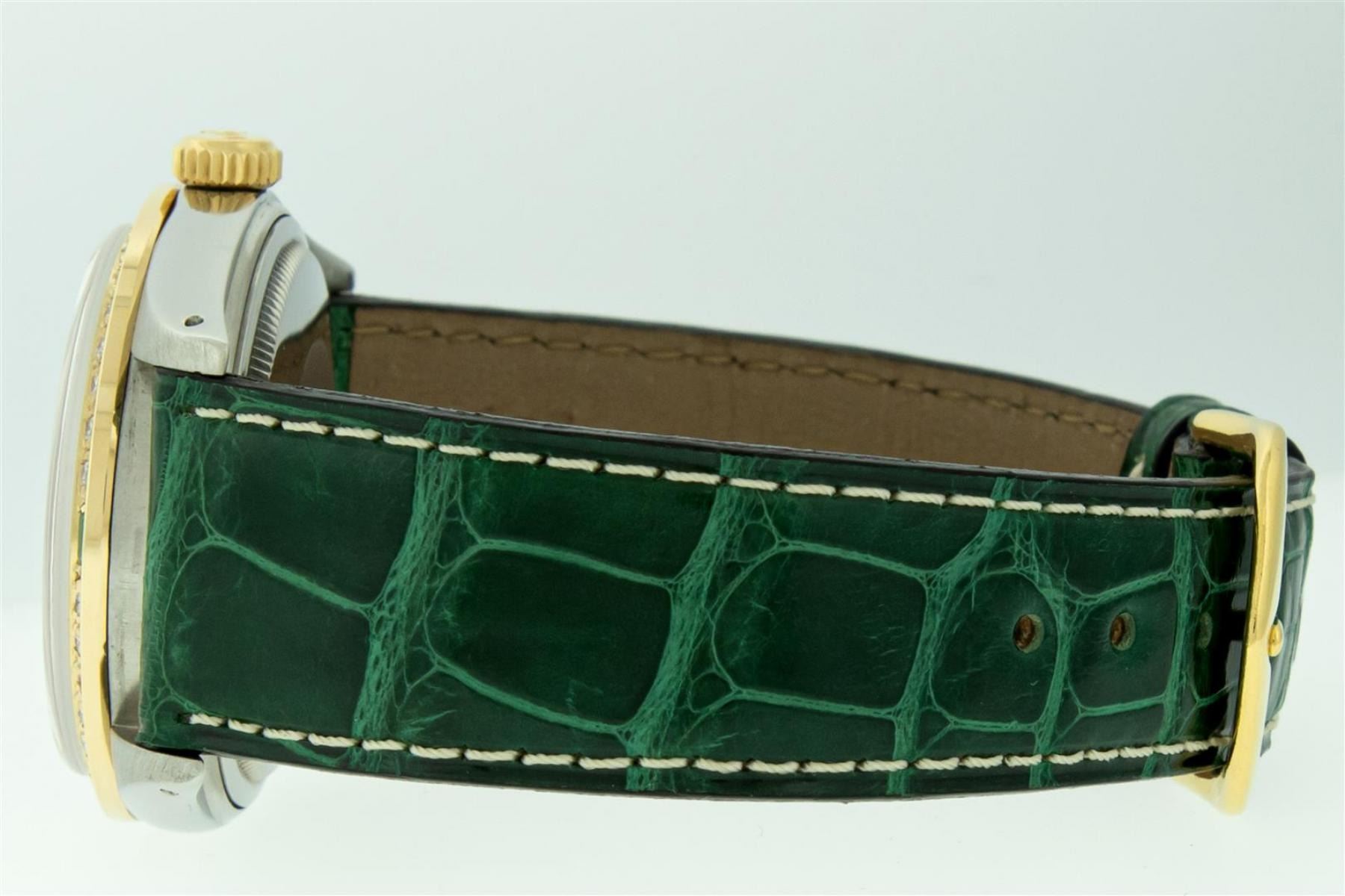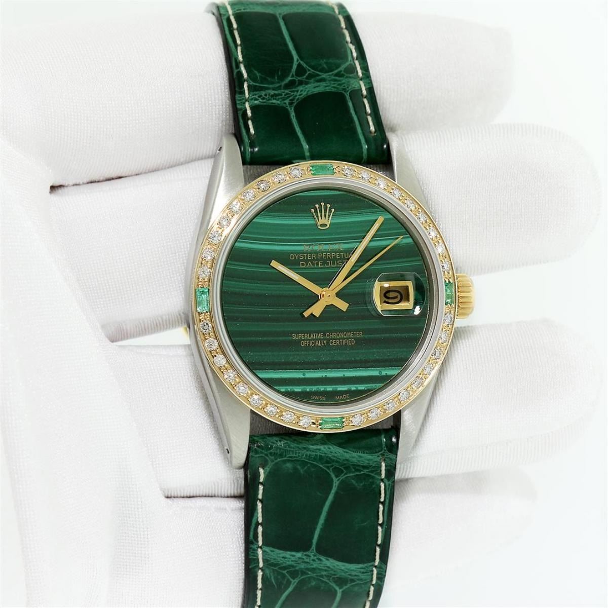 One Mens Yellow Gold Two Tone Rolex Datejust Polished, Serviced & Electronically Tested, Yellow Gold & Stainless Steel Case: 36mm, Yellow Gold Crown, Custom Bezel: 18K Yellow Gold Emerald Beadset Diamond Bezel, Diamond Count: 36 Diamonds + 4 Emeralds In Bezel, Total Bezel Weight 1.00 Carat, Clarity: SI-VS, Color: G to H. Custom Crystal: New Scratch Resistant Synthetic Sapphire Cyclops Lens. Custom Hands: New Luminecent Hands. Movement: Automatic Winding Movement. Custom Dial: Green Malachite Dial. Date Window: 3 O'Clock Position Date Display, Quickset, Model: Datejust. Condition: G-6 Extra Fine. Custom Band: New Green Leather Band With White Stitching. 7.0 Inch Length. New Custom Pink Buckle Clasp. This Watch Has Been Serviced Time Tested And Is In Excellent Condition It Is Free Of All Scratches And Dents. This Watch Comes With A Rolex Box.